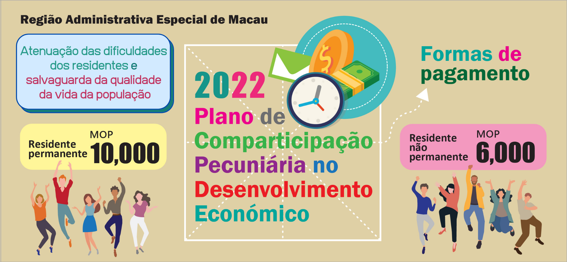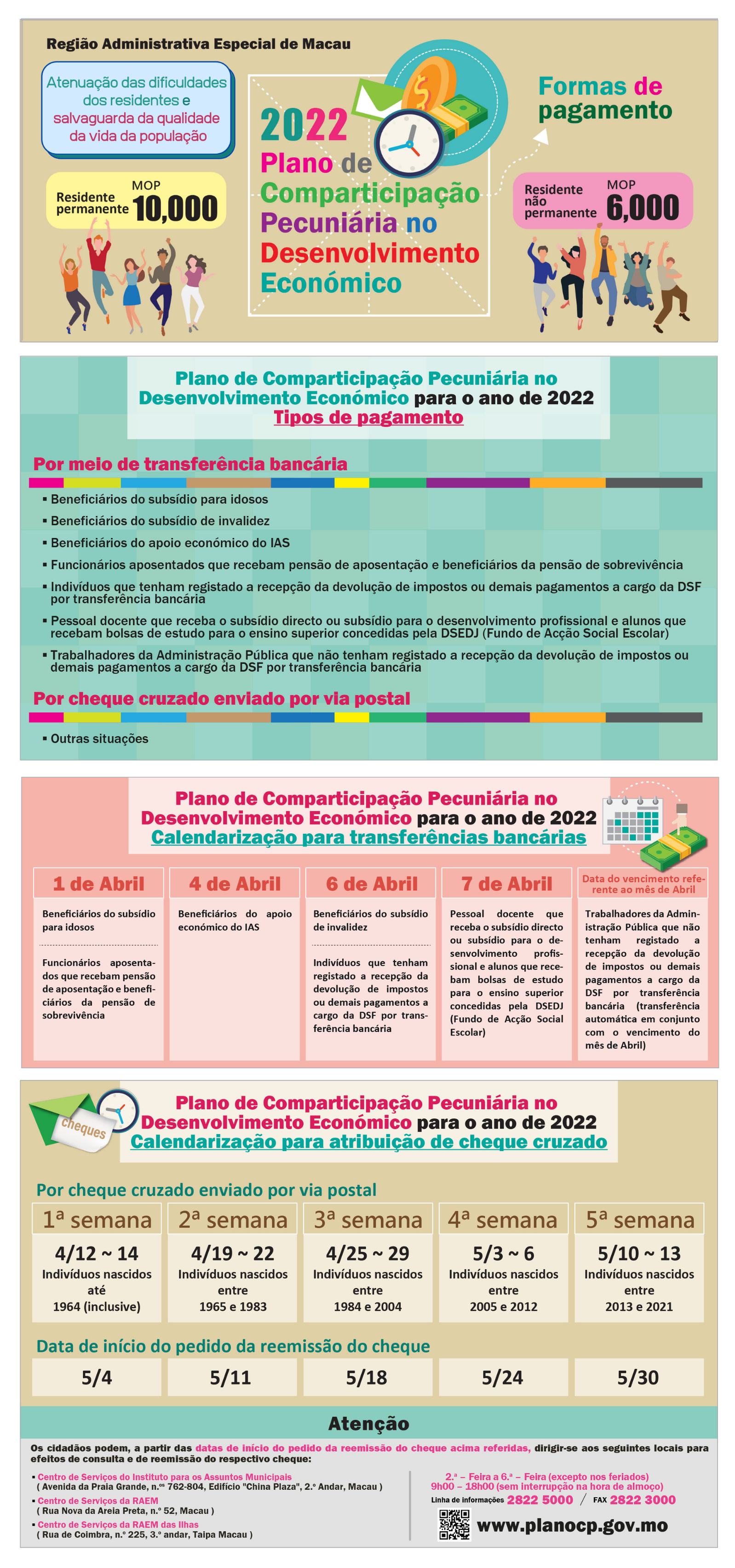 O Governo da Região Administrativa Especial de Macau (RAEM) vai promover, entre 1 de Abril e 13 de Maio, o Plano de Comparticipação Pecuniária no Desenvolvimento Económico para o Ano de 2022, atribuindo, sequencialmente, por transferência bancária ou por envio postal do cheque cruzado, a cada residente permanente, aproximadamente de 697.000 pessoas, e a cada residente não permanente, aproximadamente de 42.000 pessoas, dez mil patacas e seis mil patacas, respectivamente.