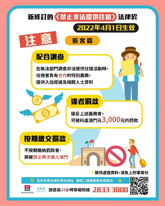 A Lei n.º 3/2022 altera as disposições da Lei n.º 3/2010 (Proibição de prestação ilegal de alojamento), estipulando agora que os não residentes da RAEM autorizados a permanecer por um período não superior a 90 dias quando entram na cidade (excepto os portadores de “autorização especial de permanência”), apenas podem alojar-se em alojamento prestado por estabelecimentos da indústria hoteleira legalmente explorados, designadamente: hotéis, hotéis-apartamentos e alojamentos de baixo custo. Considera-se prestação ilegal de alojamento, a actividade de prestação de alojamento, por pessoa ou entidade que não possuam licença de estabelecimento da indústria hoteleira, aos indivíduos anteriormente referidos, em prédio ou fracção autónoma não destinado a fins de actividade hoteleira, incluindo habitações, lojas, edifícios industriais, entre outros.