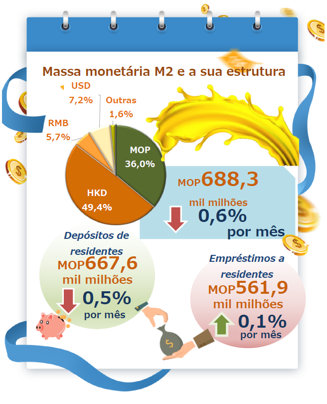 Quando comparado com o mês anterior, a circulação monetária e os depósitos à ordem decresceram 4,0% e 0,7%, respectivamente. M1, assim, decresceu 1,7%, relativamente ao mês anterior. Por enquanto, as responsabilidades quase monetárias decresceram 0,4%. A soma destes dois elementos, ou seja, M2, decresceu 0,6% relativamente ao mês anterior, tendo atingido MOP688,3 mil milhões. Quando comparado com o período homólogo de 2021, M1 e M2 decresceram 2,0% e 1,1%, respectivamente. A proporção da pataca (MOP), dos dólares de Hong Kong (HKD), dos renminbi (RMB) e dos dólares dos Estados Unidos (USD) registou os “pesos” de 36,0%, 49,4%, 5,7% e 7,2%, respectivamente, em M2.