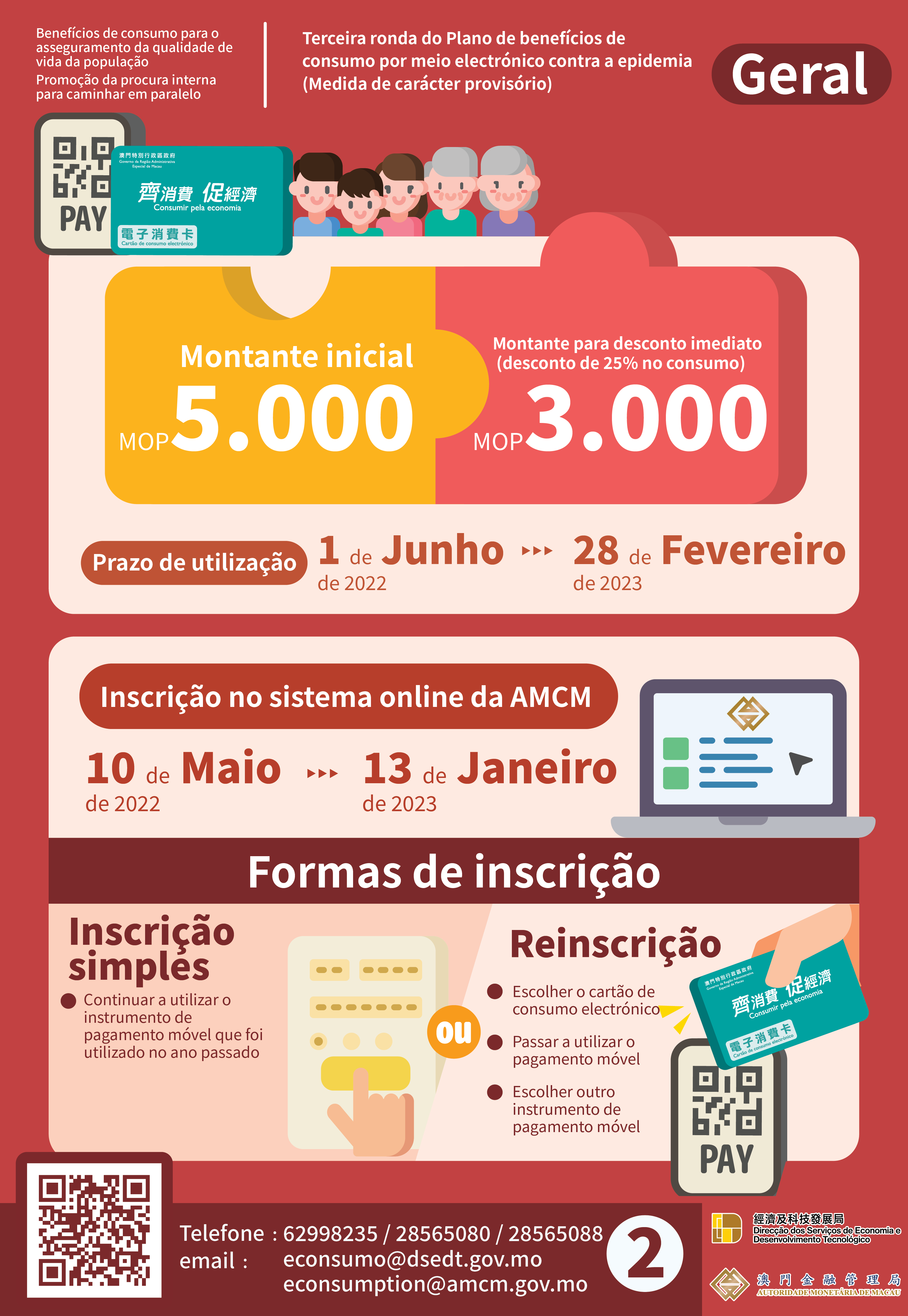 Para esclarecimento de quaisquer dúvidas acerca da “Terceira ronda do Plano de benefícios de consumo por meio electrónico contra a epidemia”, queira por favor consultar a página exclusiva da Terceira ronda do Plano (https://www.dsedt.gov.mo/econsumo), ou solicitar informações, durante o horário de expediente (De 2.ª feira a 6.ª feira, entre as 9:00 horas e as 13:00 horas e entre as 14:30 horas e as 17:45 horas), através dos seguintes meios: