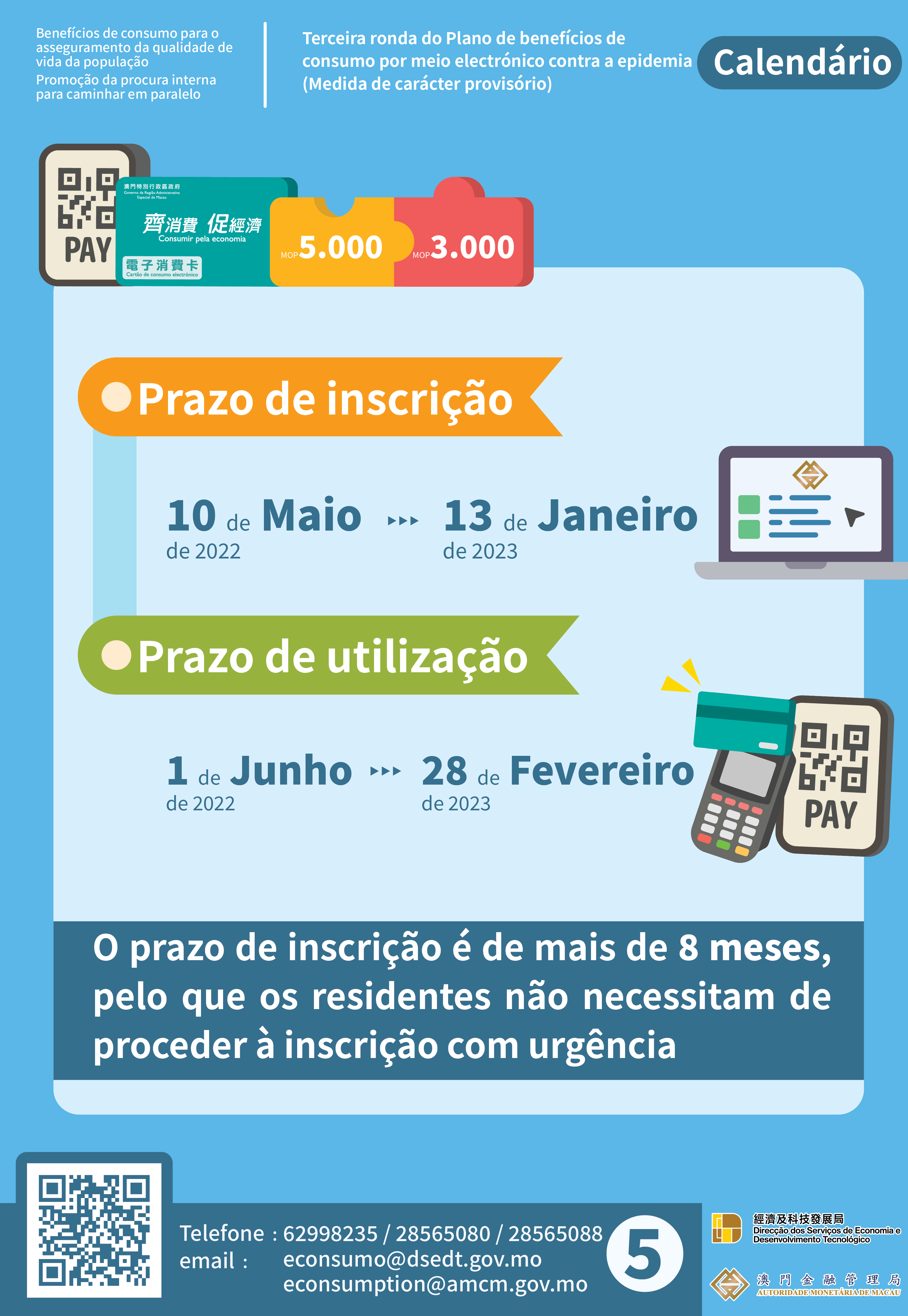 O prazo de inscrição “online” decorrerá entre 10 de Maio e 13 de Janeiro do próximo ano (2023). Os residentes que tenham efectuado, com sucesso, a inscrição, podem receber os benefícios, mais cedo, a partir de 23 de Maio, sendo o prazo de obtenção até 17 de Janeiro do próximo ano.