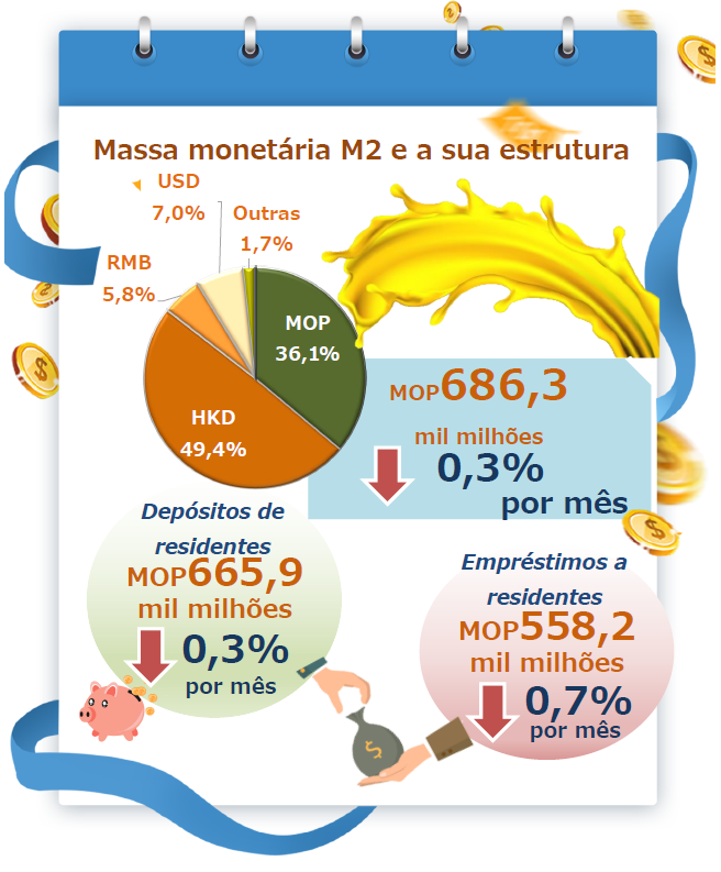 Quando comparado com o mês anterior, a circulação monetária e os depósitos à ordem decresceram 1,5% e 1,7%, respectivamente. M1, assim, decresceu 1,6%, relativamente ao mês anterior. Por enquanto, as responsabilidades quase monetárias decresceram 0,1%. A soma destes dois elementos, ou seja, M2, decresceu 0,3% relativamente ao mês anterior, tendo atingido MOP686,3 mil milhões. Quando comparado com o período homólogo de 2021, M1 e M2 decresceram 1,6% e 1,9%, respectivamente. A proporção da pataca (MOP), dos dólares de Hong Kong (HKD), dos renminbi (RMB) e dos dólares dos Estados Unidos (USD) registou os “pesos” de 36,1%, 49,4%, 5,8% e 7,0%, respectivamente, em M2.
