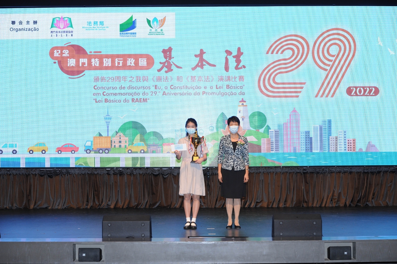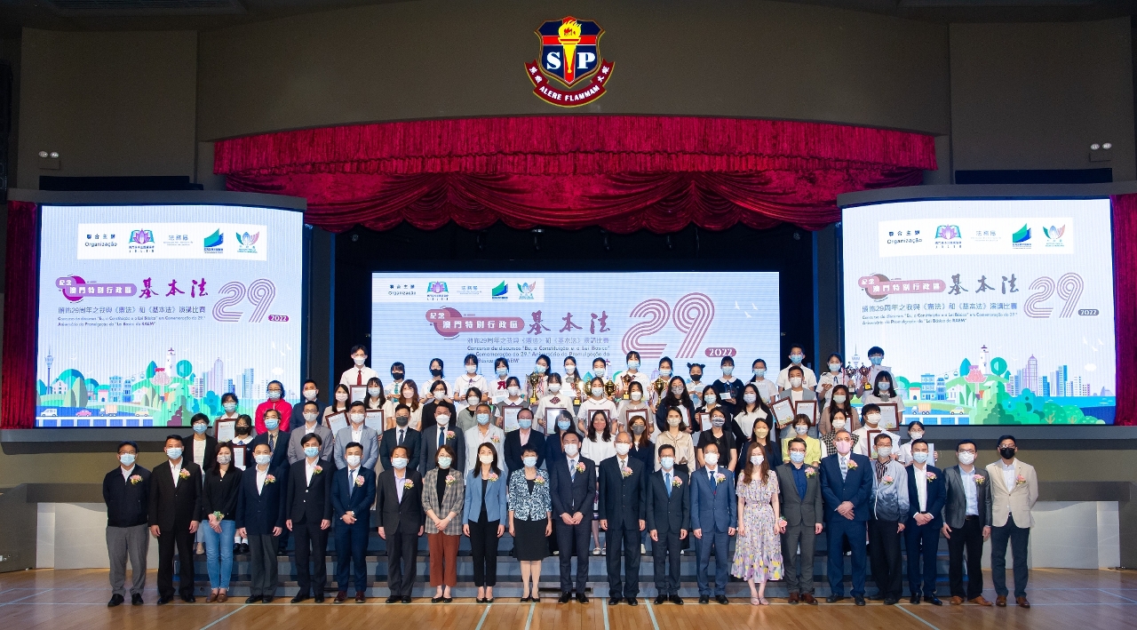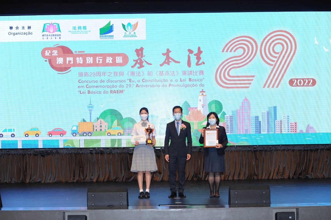 Dando continuidade à promoção da “Constituição” e da “Lei Básica” junto dos alunos e dos jovens, foi realizada, com sucesso, no dia 15 de Maio, no auditório da Escola São Paulo, a prova final do Concurso de Discursos “Eu, a Constituição e a Lei Básica”, no âmbito da Comemoração do 29.º Aniversário da Promulgação da “Lei Básica da Região Administrativa Especial de Macau”. O Concurso foi organizado, conjuntamente, pela Associação de Divulgação da Lei Básica de Macau, pela Direcção dos Serviços de Assuntos de Justiça (DSAJ), pela Direcção dos Serviços de Educação e de Desenvolvimento da Juventude (DSEDJ) e pelo Instituto para os Assuntos Municipais (IAM). Para articular com os trabalhos de prevenção epidémica e evitar a concentração de pessoas, esta edição do concurso foi mais reduzida, optando-se pela sua transmissão online e em directo para que os professores e os colegas dos candidatos os pudessem apoiar.