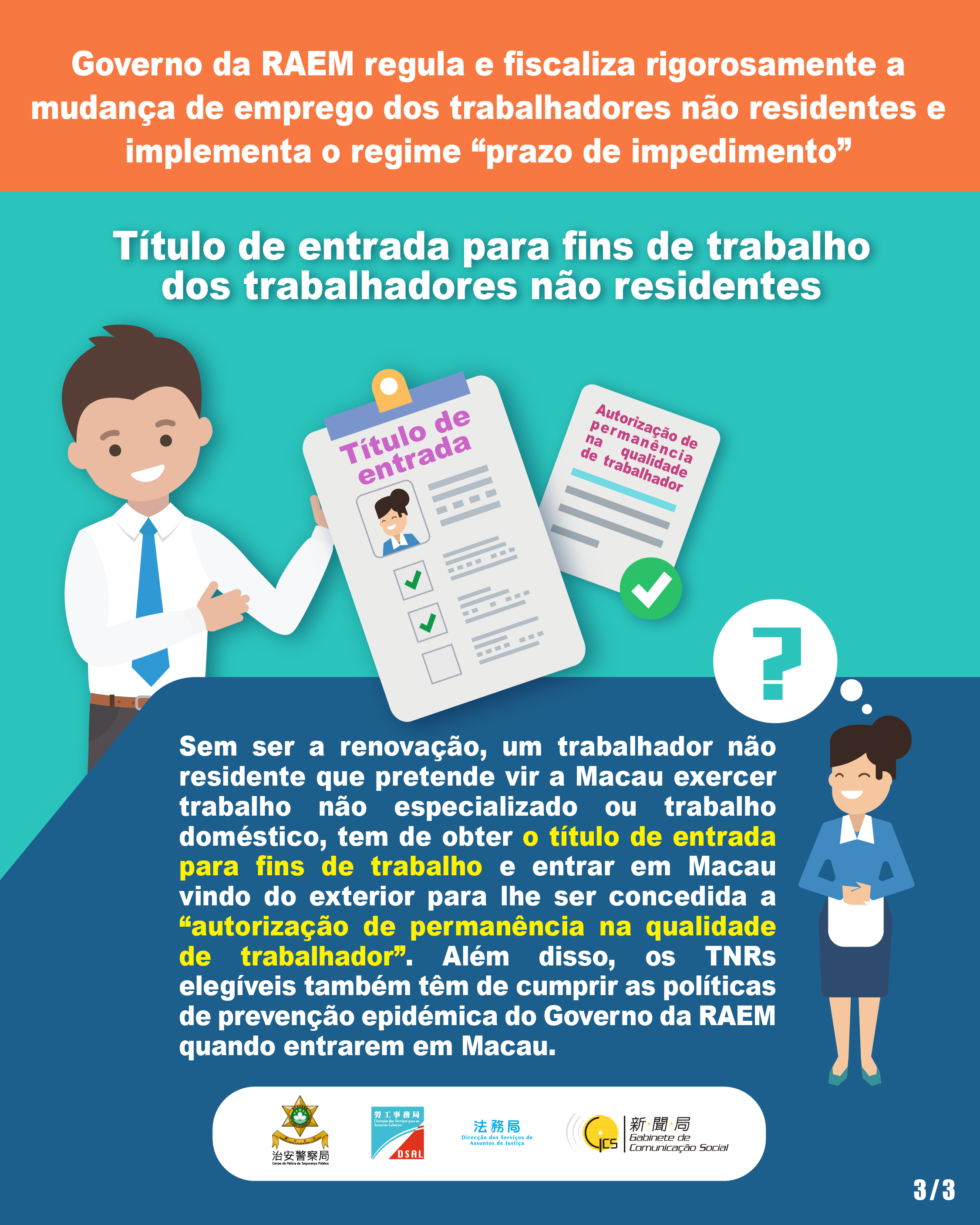 O Governo da RAEM regula e fiscaliza, nos termos da lei, a mudança de emprego dos trabalhadores não residentes, doravante designados por TNRs. Ao abrigo das disposições da vigente Lei da contratação de trabalhadores não residentes, os TNRs podem apenas prestar, em Macau, o serviço ao empregador constante no seu ‘‘título de identificação de trabalhador não residente’’ que é vulgarmente conhecido por “cartão azul” e exercer exclusivamente os trabalhos relativos ao cargo autorizado e constante no “cartão azul”. A lei acima referida dispõe, simultaneamente, do regime “prazo de impedimento” para regular e fiscalizar os fenómenos de os TNRs provocarem propositadamente o seu despedimento e a mudança de emprego.