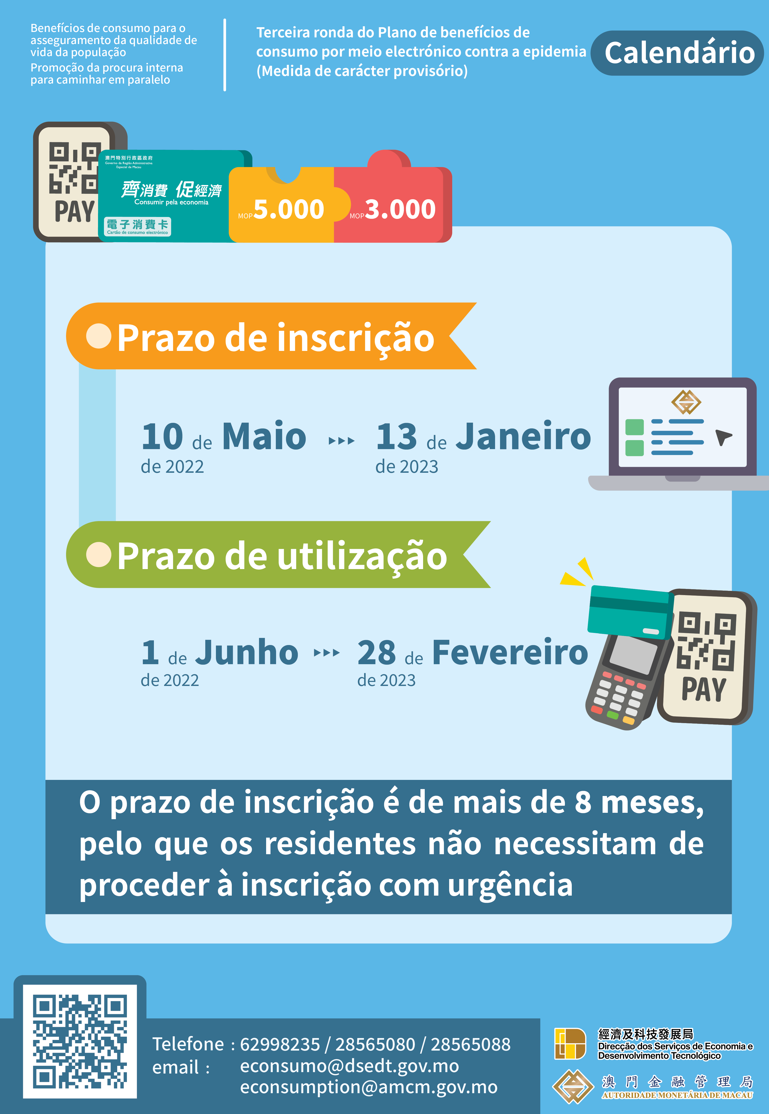 Como a inscrição sobre os “benefícios de consumo por meio electrónico” começou já a 10 de Maio, a Direcção dos Serviços e Desenvolvimento Tecnológico (DSEDT) e a Autoridade Monetário de Macau (AMCM) lançaram, antes do período de inscrição, o primeiro conjunto de infografias e vídeos curtos que apresentam, de forma simples e clara, a ideia, o calendário, os processos de inscrição, os assuntos que merecem a atenção para a utilização dos benefícios e outros assuntos no que diz respeito ao Plano.