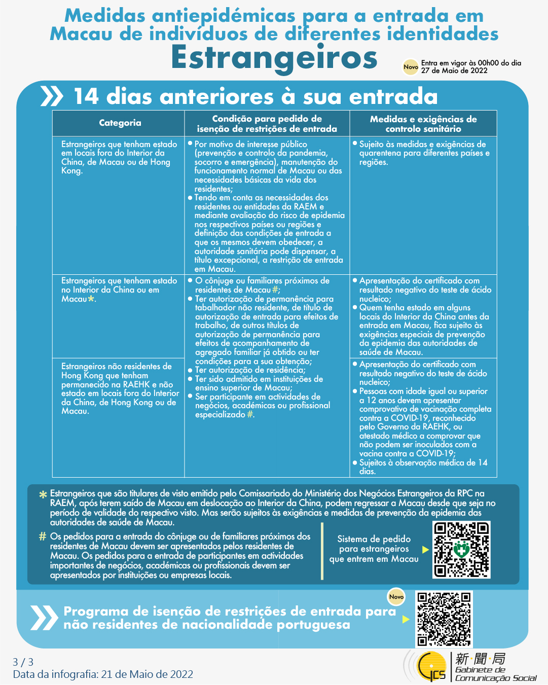 (Infografia)Medidas antiepidémicas para a entrada em Macau de indivíduos de diferentes identidades, actualizadas no dia 21 de Maio de 2022