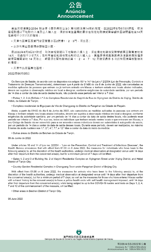 Ainda, a partir da 01h00 do dia 6 de Junho de 2022, são canceladas as medidas aplicadas às pessoas que entrem em Macau e tenham estado nos locais abaixo indicados, devem ser sujeitos à observação médica em local a designar, conforme exigências da autoridade sanitária, por um período de 14 dias a contar da data de saída destes locais, não podendo esse período ser inferior a 7 dias; Por sua vez, todos os indivíduos que tenham estado nestes locais e que entraram em Macau, o seu Código de Saúde irá ser convertido para a cor amarela e esses indivíduos devem ser submetidos à autogestão da saúde, por um período de 14 dias a contar da data de saída desses locais. Durante esse período, devem ser realizados, no máximo 5 testes de ácido nucleico nos 1.º, 2.º, 4.º, 7.º, e 12.º dias a contar da data do início da medida: Outras áreas do Distrito de Beichen da Cidade de Tianjin.