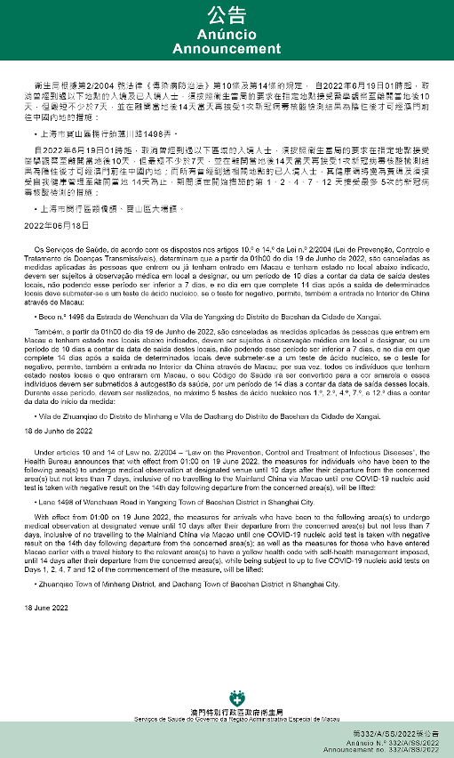 Anuncia-se, ainda, que a partir da 01h00 do dia 19 de Junho de 2022, são canceladas as medidas aplicadas às pessoas que entrem em Macau e tenham estado nos locais abaixo indicados, devem ser sujeitos à observação médica em local a designar, ou um período de 10 dias a contar da data de saída destes locais, não podendo esse período ser inferior a 7 dias e no dia em que complete 14 dias após a saída de determinados locais deve submeter‑se a um teste de ácido nucleico, se o teste for negativo, permite, também a entrada no Interior da China através de Macau; por sua vez, todos os indivíduos que tenham estado nestes locais e que entraram em Macau, o seu Código de Saúde irá ser convertido para a cor amarela e esses indivíduos devem ser submetidos à autogestão da saúde, por um período de 14 dias a contar da data de saída desses locais. Durante esse período, devem ser realizados, no máximo 5 testes de ácido nucleico nos 1.º, 2.º, 4.º, 7.º, e 12.º dias a contar da data do início da medida: