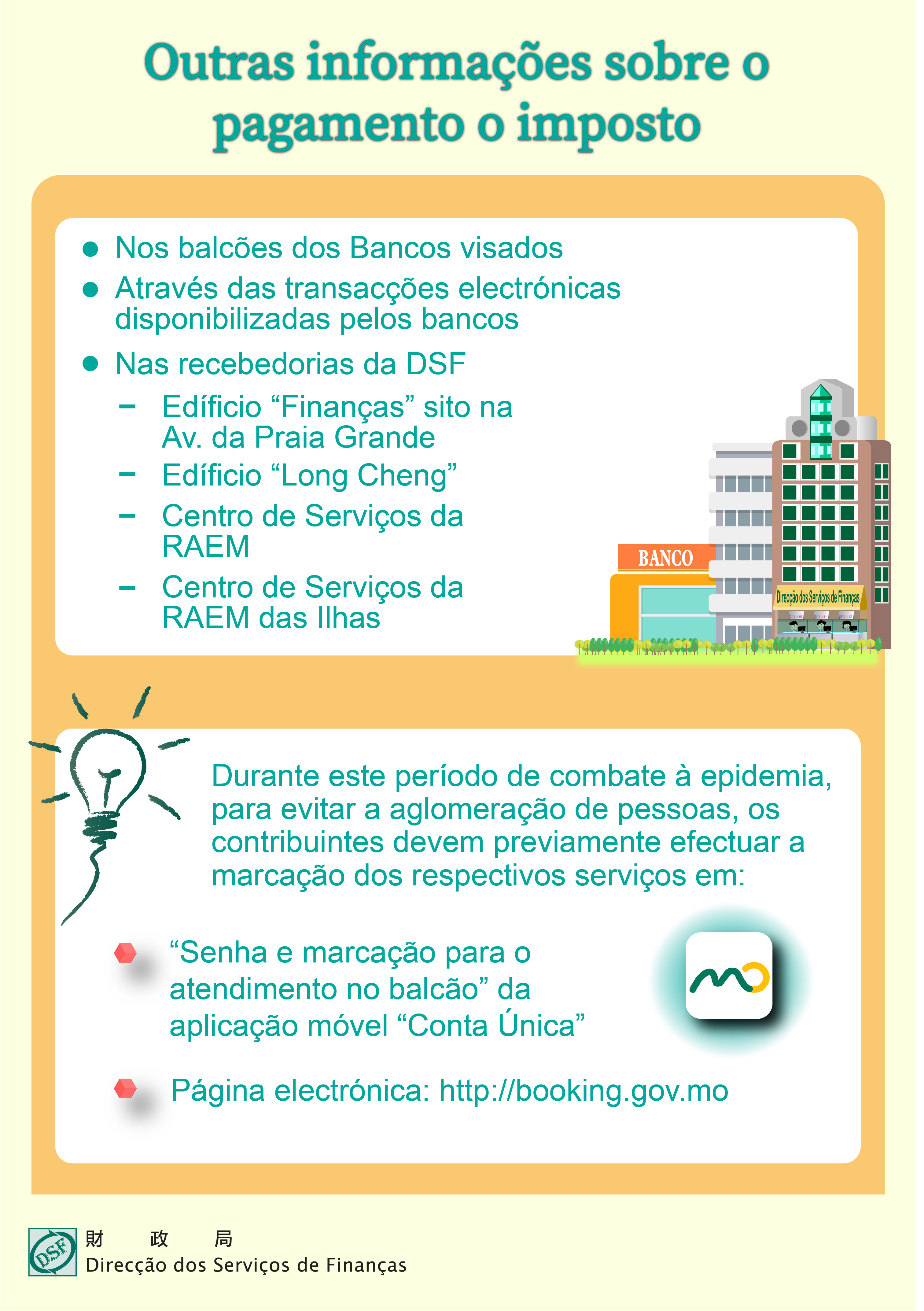 Durante este período de combate à epidemia, para evitar a aglomeração de pessoas, os contribuintes devem previamente efectuar a marcação dos respectivos serviços em: (1) “Senha e marcação para o atendimento no balcão” da aplicação móvel “Conta Única”; (2) Página electrónica ( http://booking.gov.mo ).