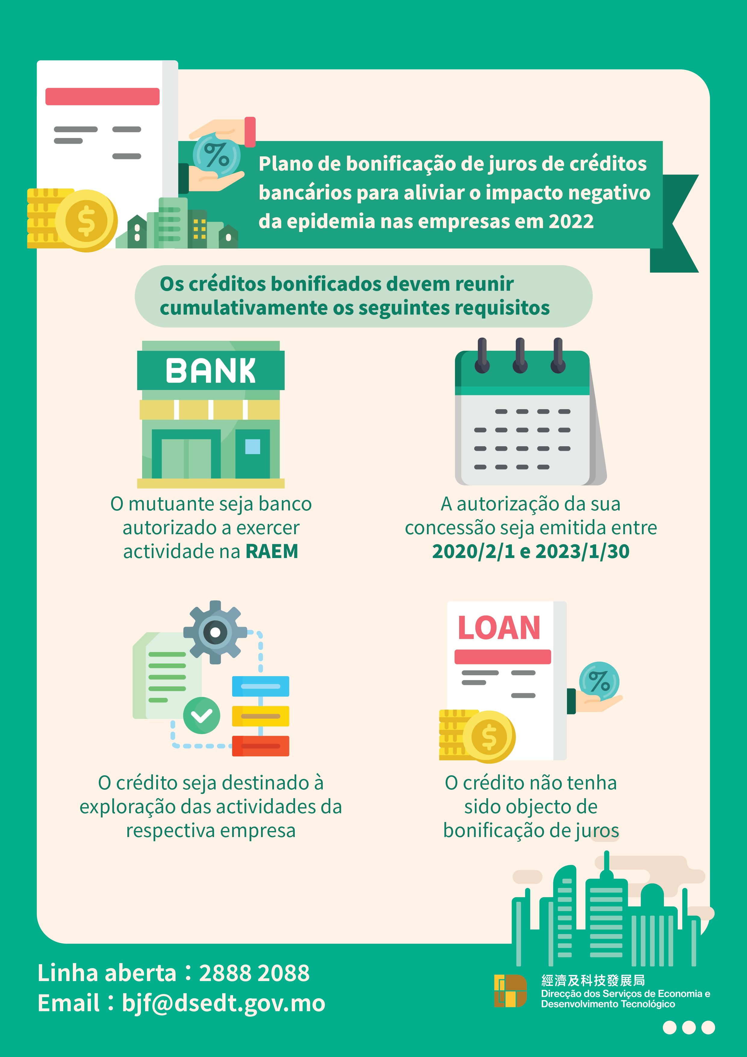 Para aliviar o impacto negativo provocado constantemente pela epidemia da pneumonia nos diversos sectores de actividade, o Governo da RAEM lançou o “Plano de bonificação de juros de créditos bancários para aliviar o impacto negativo da epidemia nas empresas em 2022” (abreviadamente designado por Plano de bonificação de juros de créditos bancários em 2022). As empresas qualificadas podem apresentar o pedido de bonificação de juros de créditos através dos bancos. O montante máximo do crédito bonificado é de 5 milhões de patacas, com um prazo máximo de bonificação de 2 anos e uma taxa anual de bonificação até 4%.