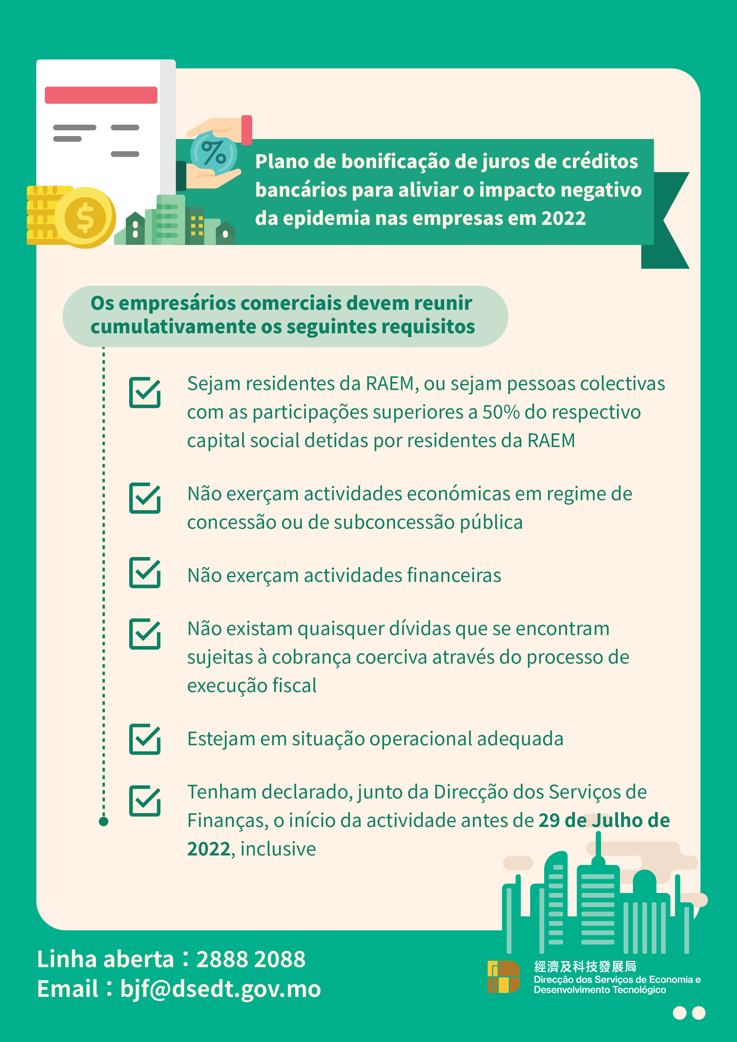 Nos termos do Regulamento Administrativo n.º 35/2022 (Plano de bonificação de juros de créditos bancários para aliviar o impacto negativo da epidemia nas empresas em 2022) e do Despacho do Chefe do Executivo n.º 138/2022, as empresas qualificadas podem apresentar o pedido de bonificação de juros, de caracter provisório, através do banco, caso seja concedido, por um banco licenciado de Macau, um crédito destinado à exploração das actividades da empresa no período entre 1 de Fevereiro de 2020 e o termo do prazo de candidatura. O prazo de apresentação de candidatura ao Plano decorre entre 30 de Julho de 2022 e 30 de Janeiro de 2023.
