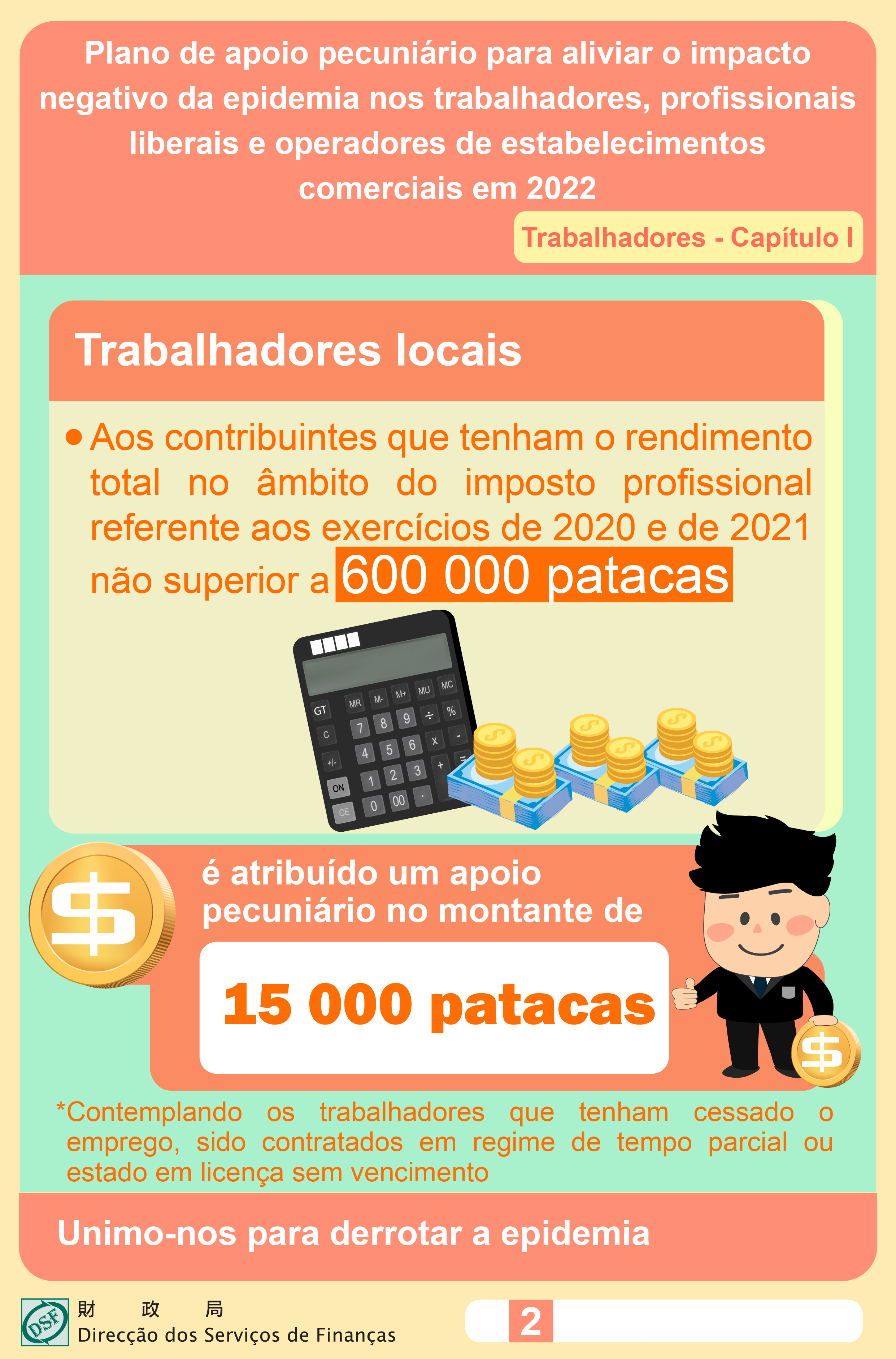 No âmbito do apoio a trabalhadores, aos trabalhadores locais que nos exercícios de 2020 e 2021 tiveram rendimentos do trabalho não excedentes a 600.000 patacas na sua totalidade, incluindo os trabalhadores que, embora reunissem os requisitos de rendimentos do trabalho, se encontravam em situação de subemprego, lay-off, em regime de tempo parcial e desvinculação durante a epidemia, é atribuído 15.000 patacas por cada um deles.
