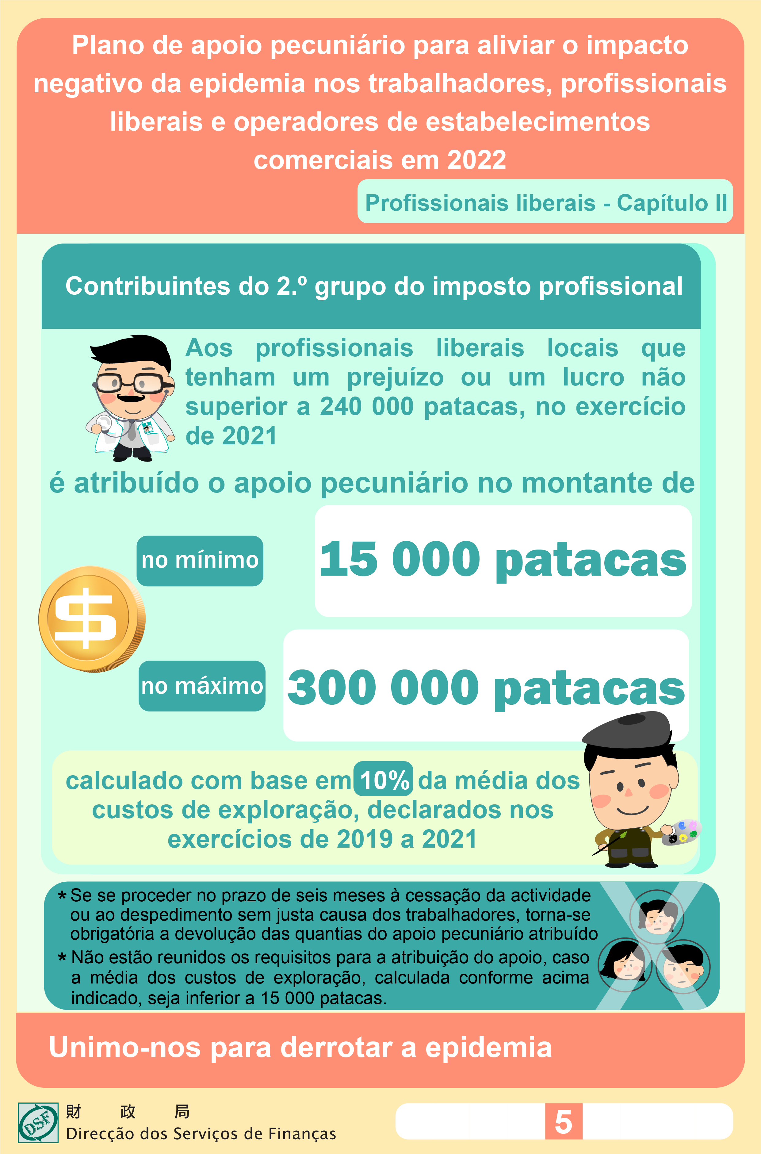 O segundo tipo refere-se a profissionais liberais locais que tenham efectuado o registo na DSF como contribuintes do 2.º grupo do imposto profissional e que, no âmbito do imposto profissional do exercício de 2021, tenham declarado a inexistência de lucros ou a existência de lucros cujo montante não seja superior a 240.000 patacas nos resultados, assim, o cálculo é feito com base em 10% do valor médio da quantia dos encargos declarados no âmbito do imposto profissional dos exercícios de 2019 a 2021, sendo o montante de apoio no mínimo de 15.000 patacas por pessoa e no máximo de 300.000 patacas por pessoa.