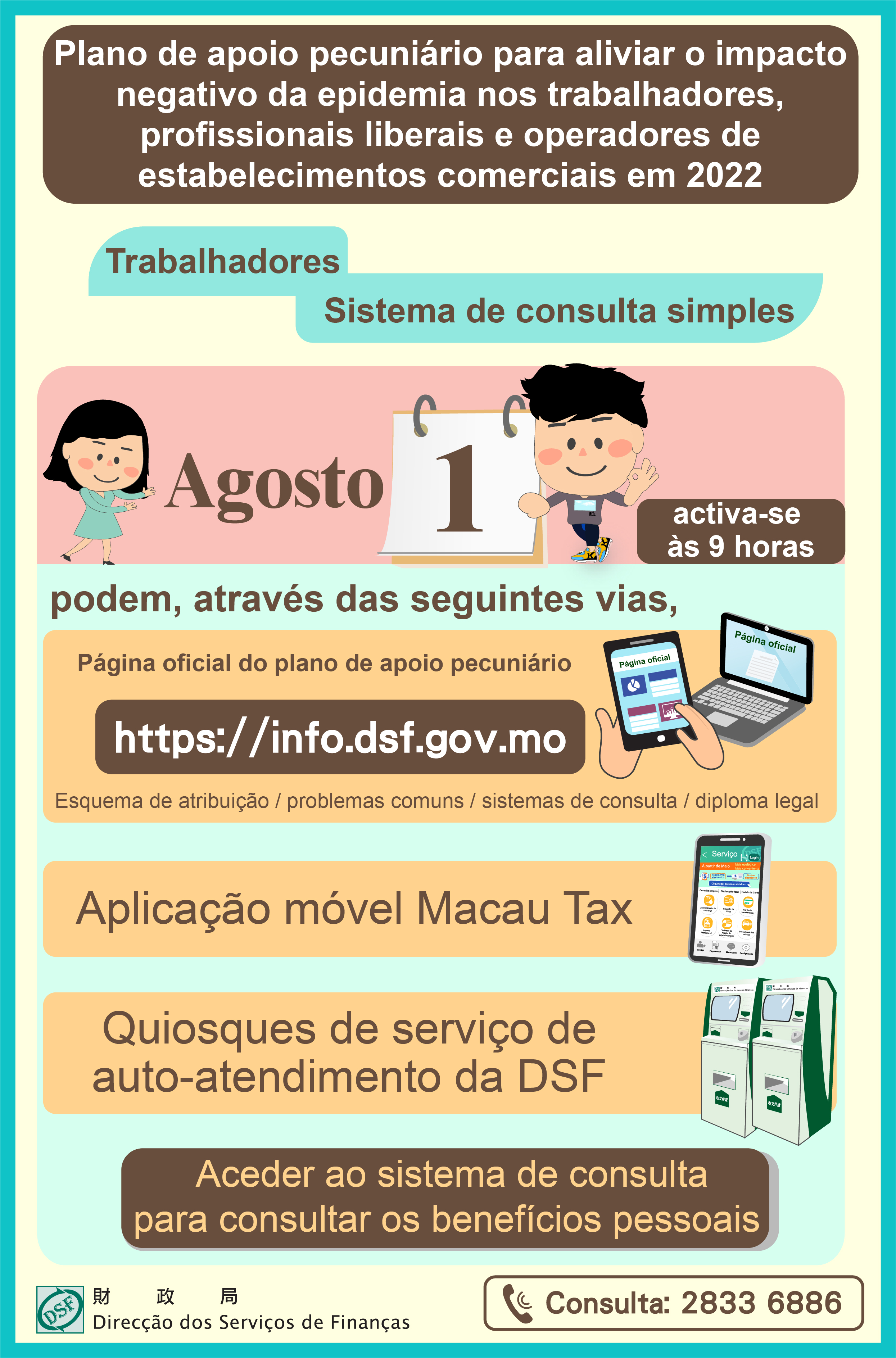 A Direcção dos Serviços de Finanças (DSF) vai promover, amanhã (dia 1), às 9 horas da manhã, a página oficial online (https://info.dsf.gov.mo) do “plano de apoio pecuniário para aliviar o impacto negativo da epidemia nos trabalhadores, profissionais liberais e operadores de estabelecimentos comerciais em 2022”, disponibilizando informações detalhadas que abrangem: o esquema de atribuição, os sistemas de consulta, os problemas comuns, as informações promocionais e as notícias actualizadas.