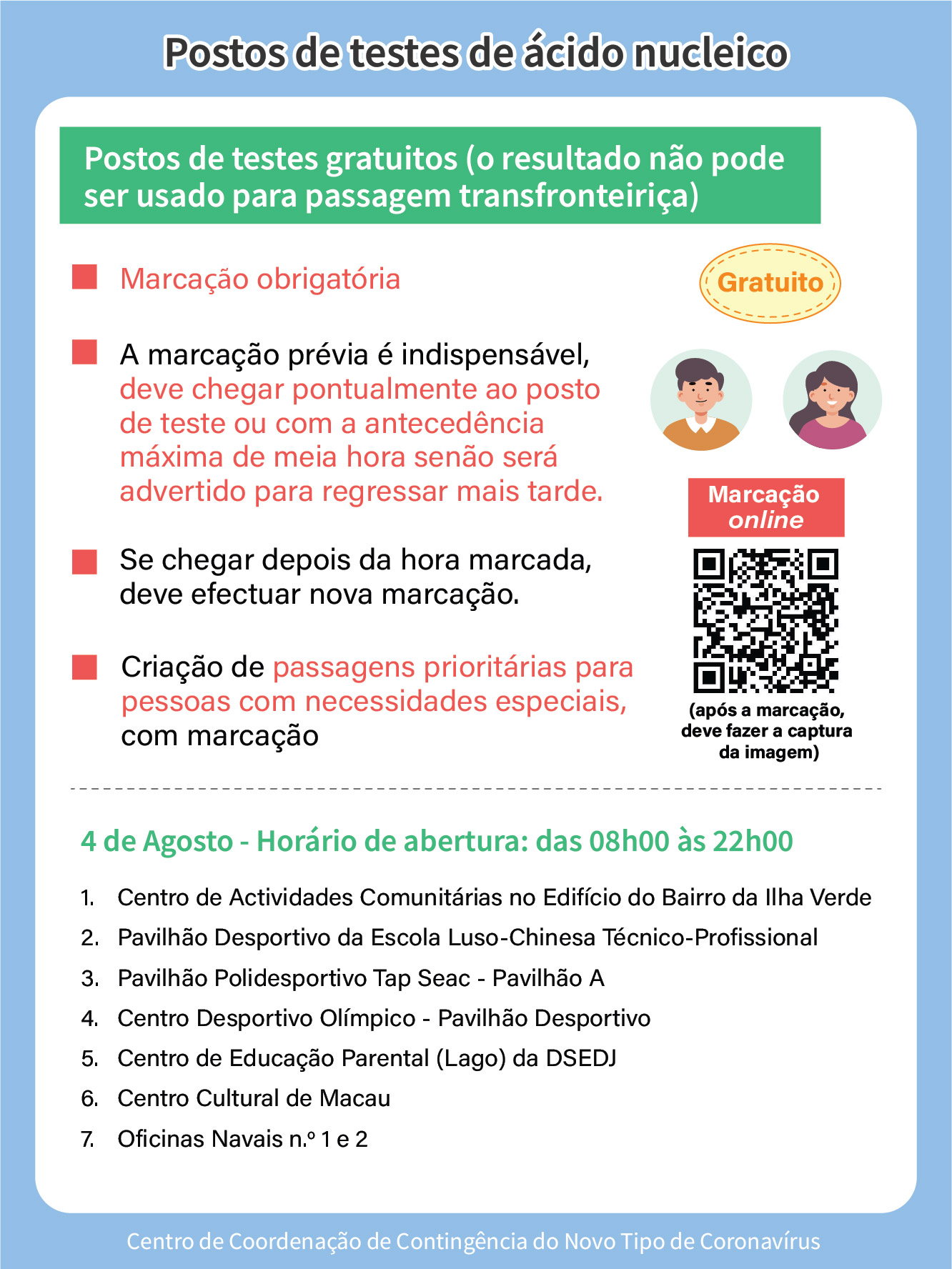 I. Postos de teste de ácido nucleico gratuitos (não servem para efeitos de passagem fronteiriça) – Horário de funcionamento: 08h00 às 22h00.