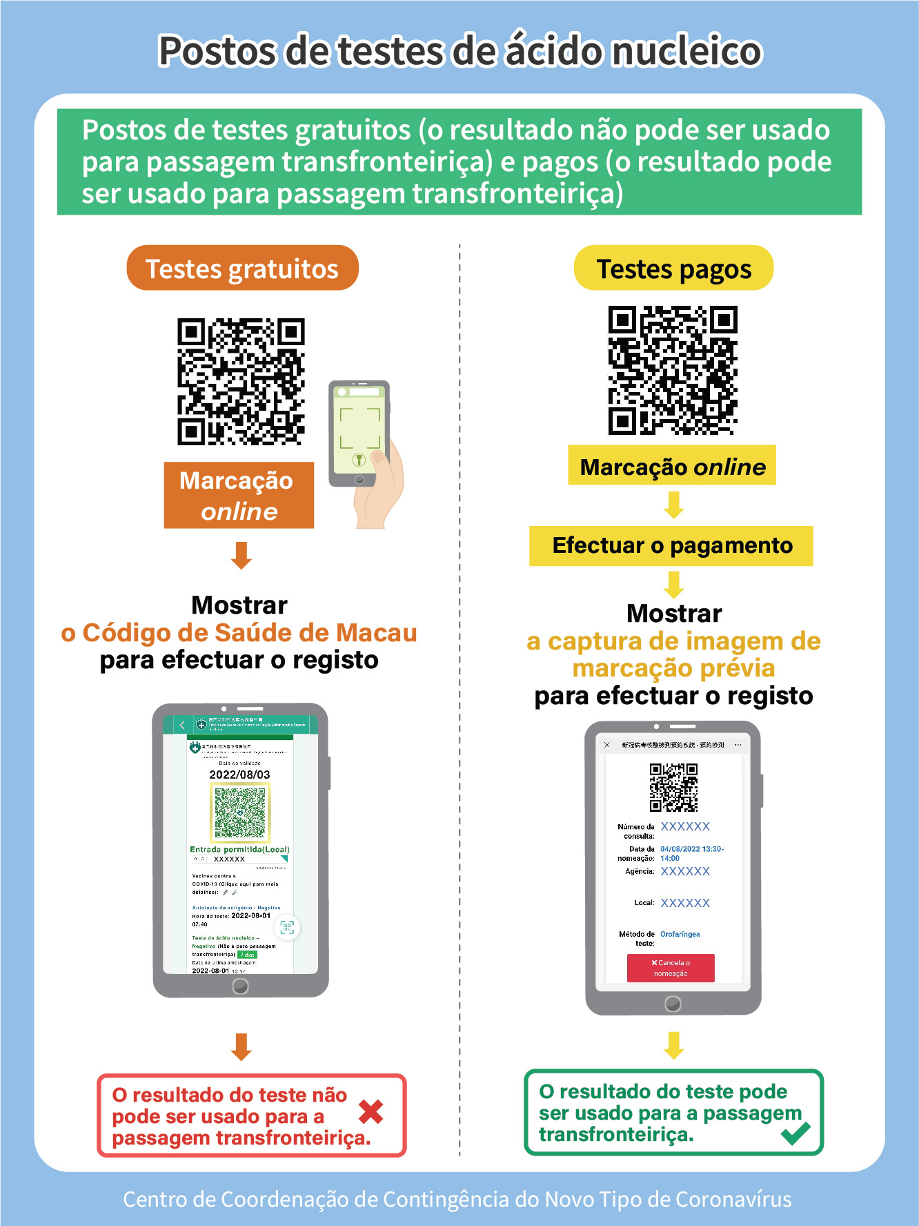 - As pessoas que pretendam realizar testes gratuitos neste postos de usar a ligação electrónica de agendamento destinado aos postos gratuitos. Ao entrar no posto, devem exibir o código de saúde. O resultado do teste será visível no Código de Saúde de Macau, mas não pode ser usado para a passagem fronteiriça.