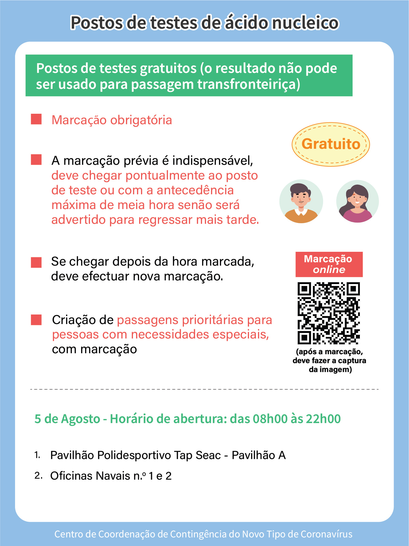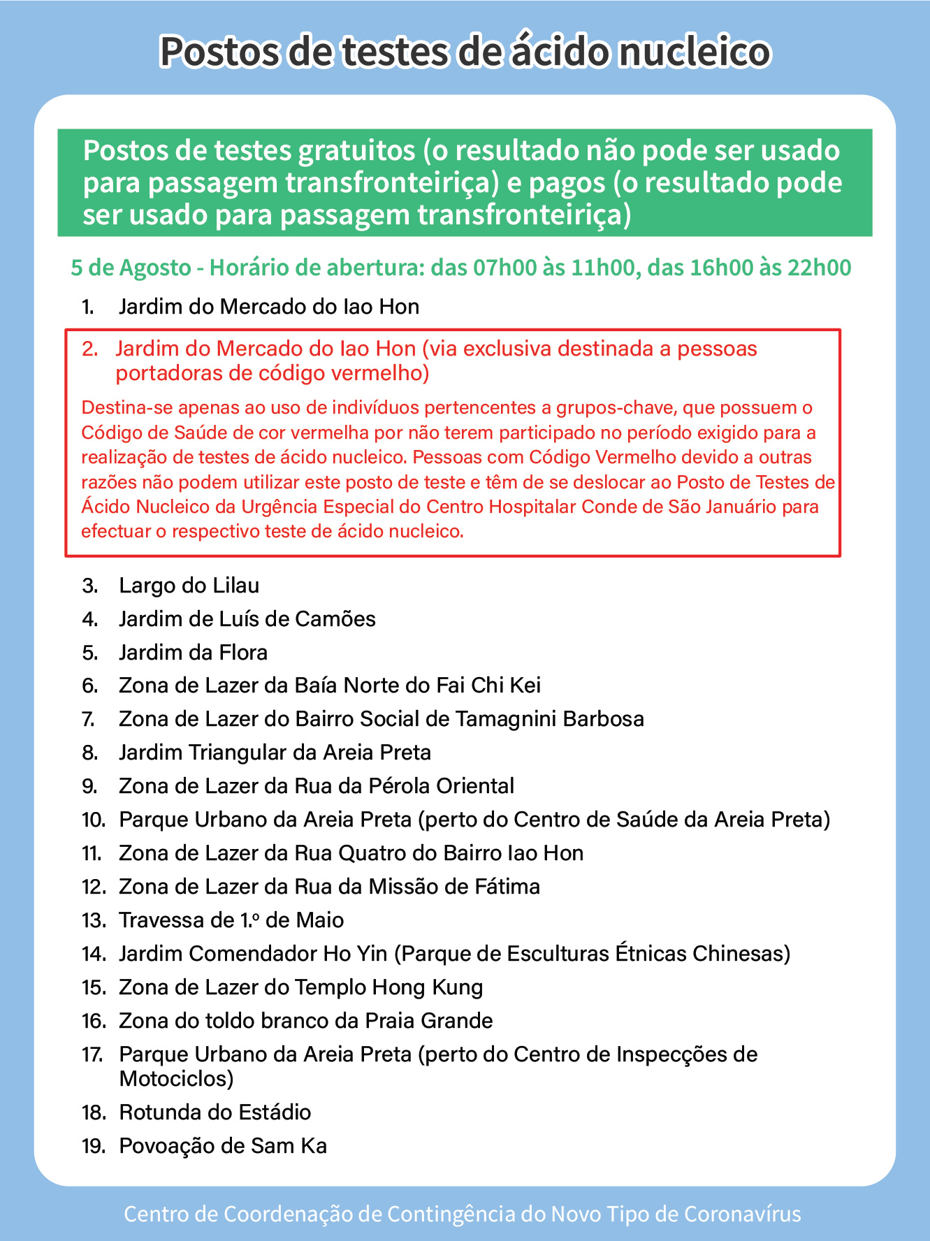 II. Postos de teste de ácido nucleico gratuito (não servem para efeitos de passagem fronteiriça) – Horário de funcionamento: 08h00 às 22h00.