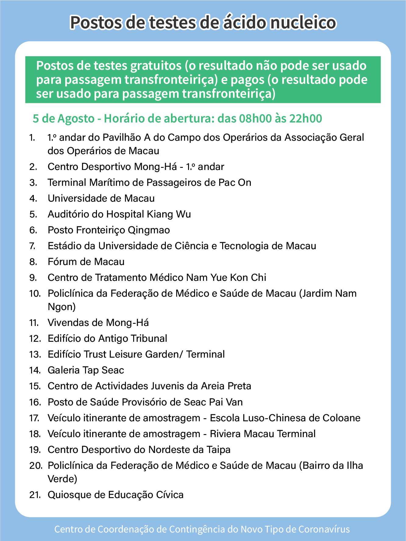 Em articulação com a necessidade de realização de teste de ácido nucleico por diversos grupos de pessoas, a localização de vários postos de teste de ácido nucleico foi actualizada no dia 5 de Agosto.