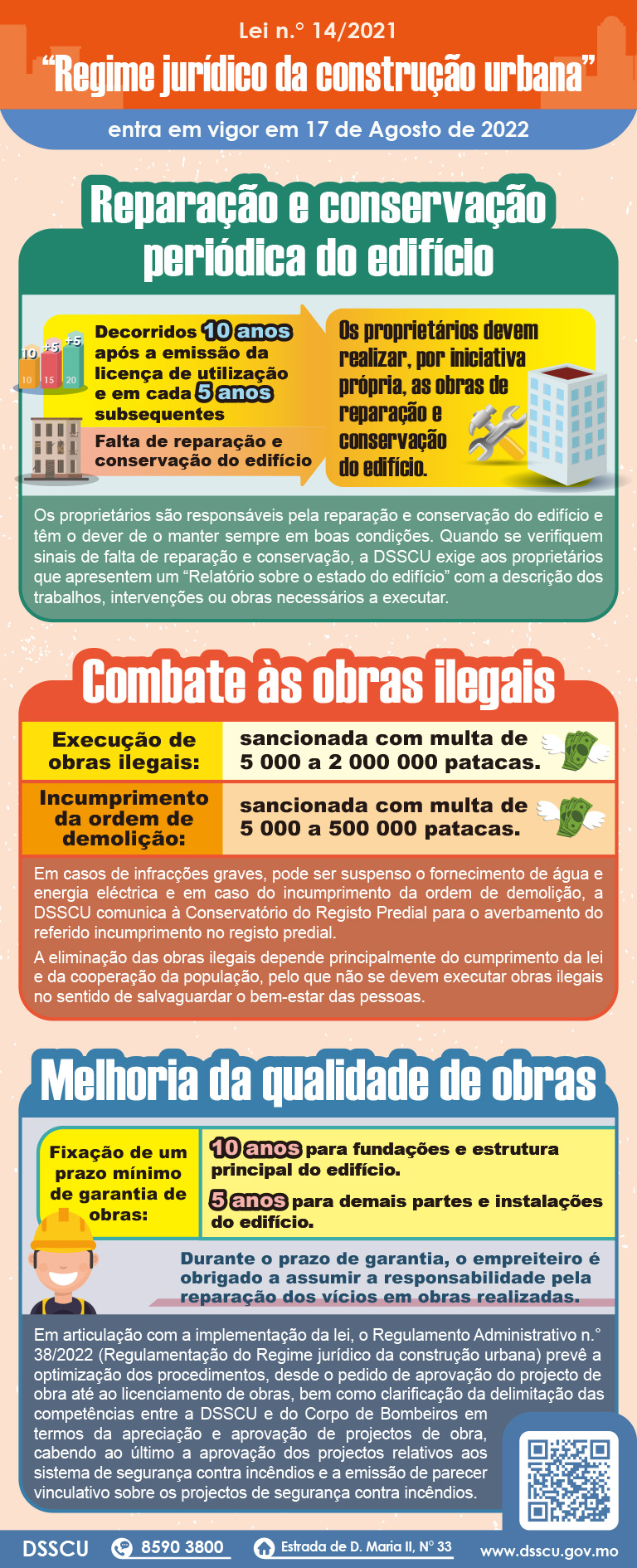 A Lei n.° 14/2021 (Regime jurídico da construção urbana) entra hoje (dia 17) em vigor a qual visa optimizar os procedimentos de apreciação e aprovação dos projectos de obra e de licenciamento e definir, claramente, as medidas a adoptar em termos de reparação e conservação de edifícios e da fiscalização de obras ilegais, bem como os respectivos procedimentos sancionatórios. Em articulação com a implementação da lei, o Regulamento Administrativo n.° 38/2022 (Regulamentação do regime jurídico da construção urbana) entra também hoje em vigor.
