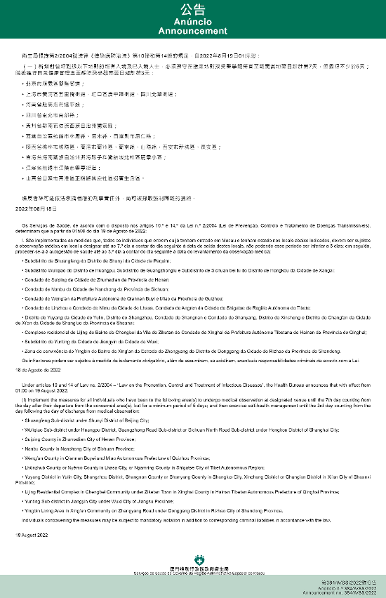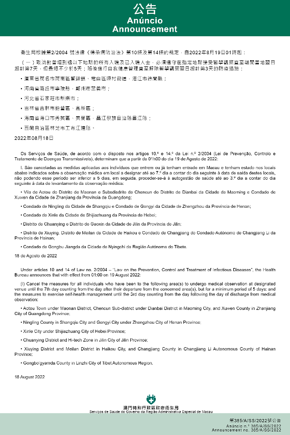 Tendo em consideração a evolução epidemiológica mais actualizada no Interior da China, os Serviços de Saúde, de acordo com o disposto nos artigos 10.º e 14.º da Lei n.º 2/2004 (Lei de Prevenção, Controlo e Tratamento de Doenças Transmissíveis), determinam que a partir da 01h00 do dia 19 de Agosto de 2022, são implementadas ou canceladas as medidas antiepidémicas para quem tenha estado em diversas áreas do Interior da China: