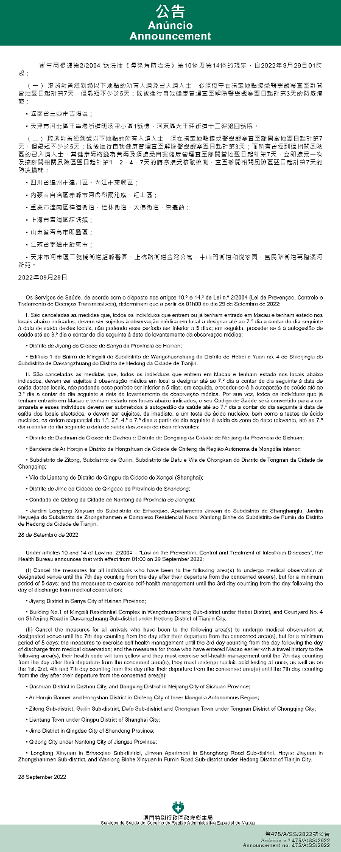 Tendo em consideração a evolução epidemiológica mais actualizada no Interior da China, os Serviços de Saúde, de acordo com o disposto nos artigos 10.º e 14.º da Lei n.º 2/2004 (Lei de Prevenção, Controlo e Tratamento de Doenças Transmissíveis), determinam que a partir da 01h00 do dia 27 de Setembro de 2022, são implementadas ou canceladas as medidas antiepidémicas para quem tenha estado em diversas áreas do Interior da China: