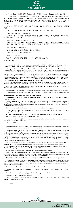 Tendo em consideração a evolução epidemiológica mais actualizada no Interior da China, os Serviços de Saúde, de acordo com o disposto nos artigos 10.º e 14.º da Lei n.º 2/2004 (Lei de Prevenção, Controlo e Tratamento de Doenças Transmissíveis), determinam que a partir da 01h00 do dia 17 de Outubro de 2022, são implementadas ou canceladas as medidas antiepidémicas para quem tenha estado em diversas áreas do Interior da China: