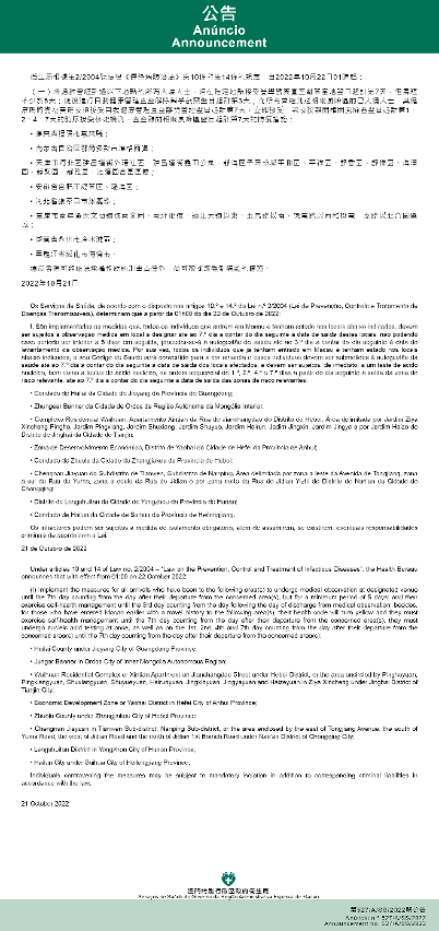 Tendo em consideração a evolução epidemiológica mais actualizada no Interior da China, os Serviços de Saúde, de acordo com o disposto nos artigos 10.º e 14.º da Lei n.º 2/2004 (Lei de Prevenção, Controlo e Tratamento de Doenças Transmissíveis), determinam que a partir da 01h00 do dia 22 de Outubro de 2022, são implementadas ou canceladas as medidas antiepidémicas para quem tenha estado em diversas áreas do Interior da China: