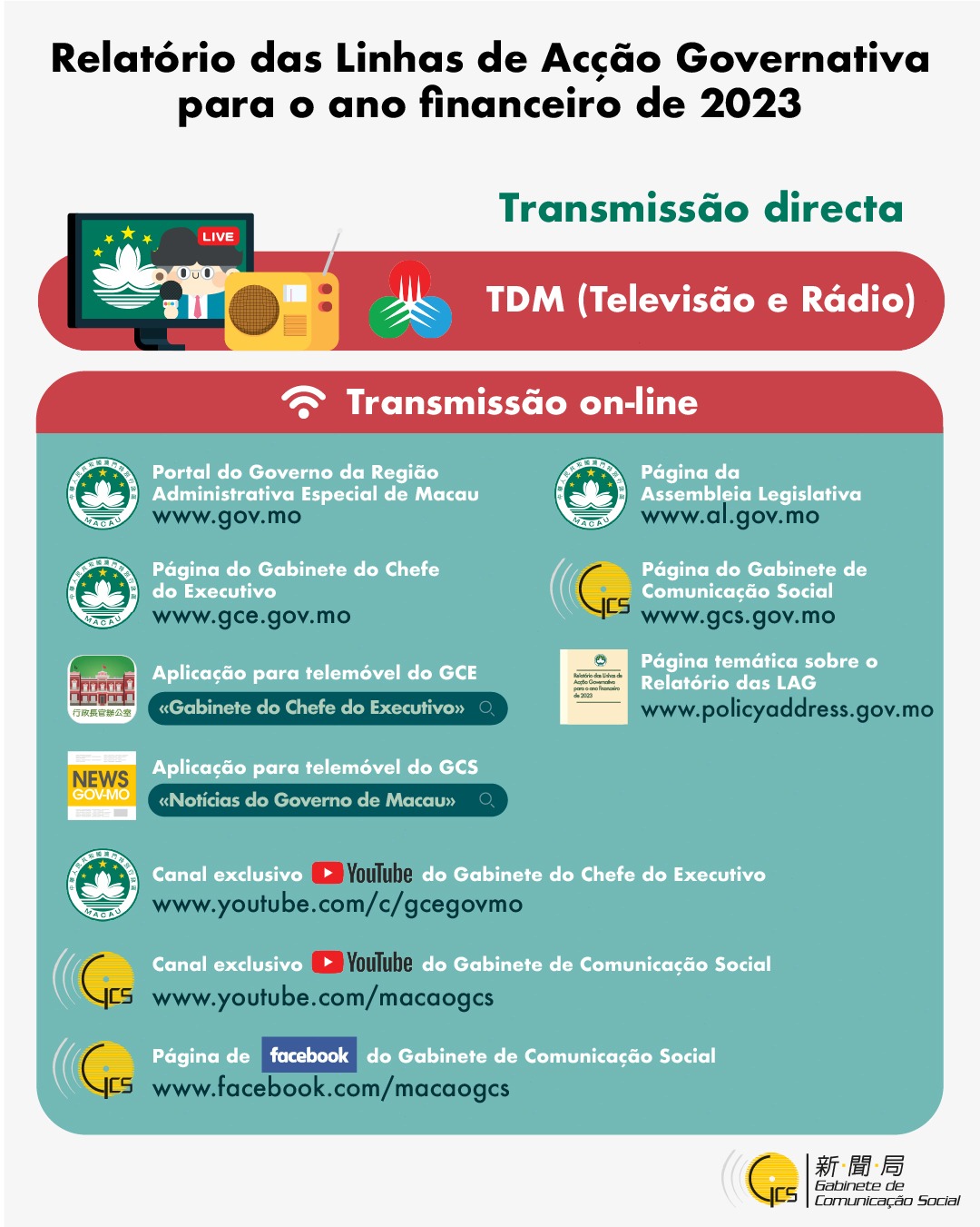 A sessão de apresentação do «Relatório das Linhas de Acção Governativa para o ano de 2023», a conferência de imprensa e a reunião plenária terão transmissão directa e integral na TDM (Televisão e Rádio). O público poderá ainda assistir à transmissão através da internet, em tempo real, acedendo ao portal do Governo da Região Administrativa Especial de Macau, e às páginas do Gabinete do Chefe do Executivo, da Assembleia Legislativa, assim como do Gabinete de Comunicação Social, ou ainda através das aplicações para telemóvel «Gabinete do Chefe do Executivo» do GCE ou «Notícias do Governo de Macau» do GCS, bem como no canal exclusivo Youtube do Gabinete do Chefe do Executivo e do GCS e na página de Facebook do GCS.