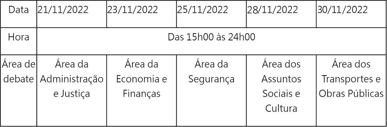 Os debates sectoriais das Linhas de Acção Governativa para 2023 serão realizados nos seguintes dias: Área de Administração e Justiça: dia 21 de Novembro; Área de Economia e Finanças: 23 Novembro; Área da Segurança: 25 de Novembro; Área de Assuntos Sociais e Cultura: 28 de Novembro; Área dos Transportes e Obras Públicas: 30 de Novembro.