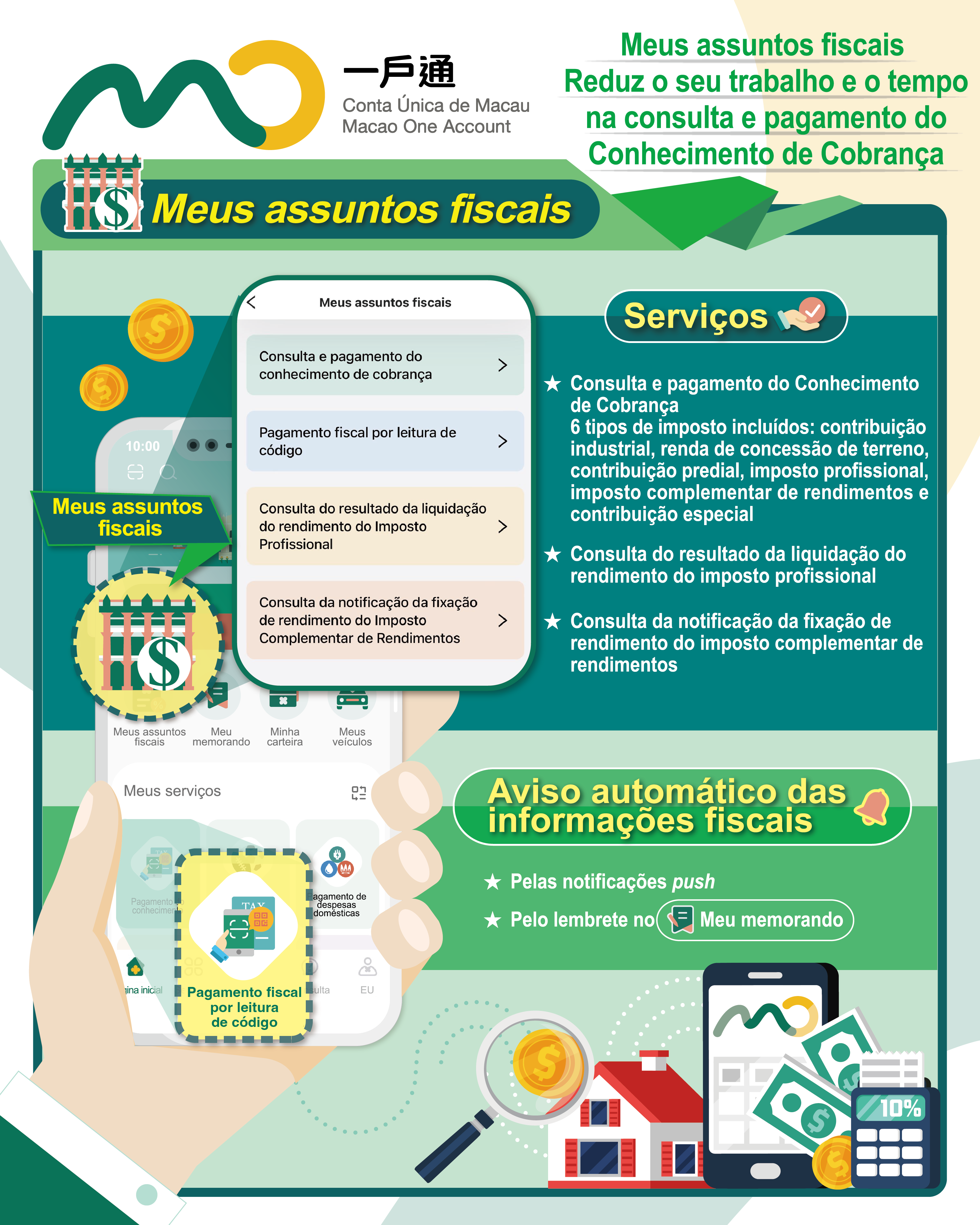A partir de 8 de Novembro de 2022, a nova funcionalidade “Meus assuntos fiscais” está disponível na aplicação para telemóvel “Conta Única de Macau”. Na fase inicial, são lançados 4 serviços fiscais mais utilizados: “Consulta e Pagamento do Conhecimento de Cobrança”, “Pagamento fiscal por leitura de código”, “Consulta do resultado da liquidação do rendimento do imposto profissional” e “Consulta da notificação da fixação de rendimento do imposto complementar de rendimentos”.