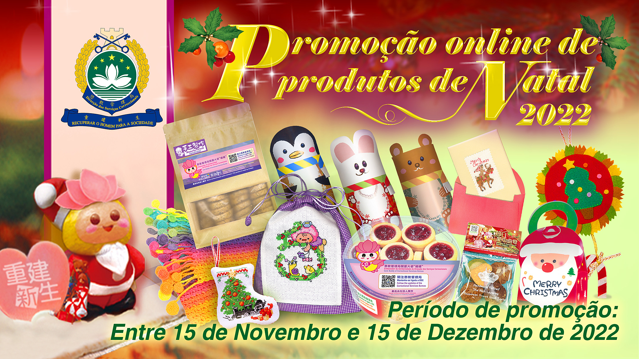 A Direcção dos Serviços Correccionais vai realizar “Promoção Online dos produtos da Festa de Natal confeccionados pelos reclusos e jovens internados” entre 15 de Novembro e 15 de Dezembro de 2022, com o objectivo de fornecer uma plataforma para exibir o fruto de aprendizagem dos reclusos e jovens internados, bem como despertar a atenção do público para apoiar a reabilitação dos mesmos. O público pode apreciar e encomendar os produtos da Festa de Natal confeccionados pelos reclusos e jovens internados através da plataforma online.