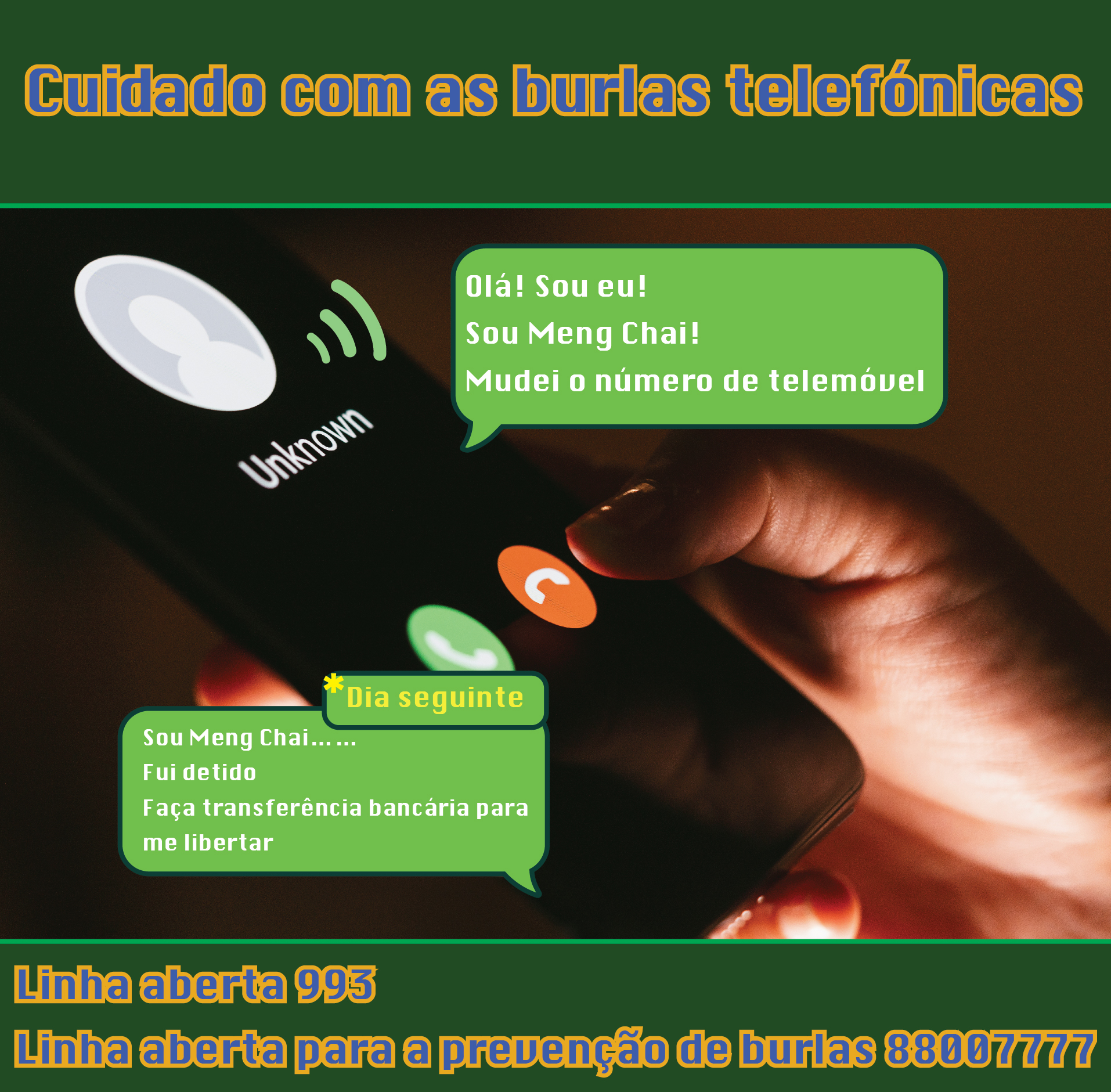 Ultimamente, a PJ tem recebido denúncias de burla telefónica que usam o esquema “Adivinha quem sou eu?”. O burlão entrou na conta do software de comunicação de telemóvel, e telefonou à vítima, fingiu ter problemas com a lei e ter sido detido fora de Macau, pediu-lhe então dinheiro para ser libertado sob fiança. Quando o burlão conseguiu receber aquela quantia, pediu-lhe mais dinheiro. A vítima só descobriu o engano quando estava a fazer a remessa de dinheiro no banco onde o funcionário bancário alertou-o acerca da possível burla.