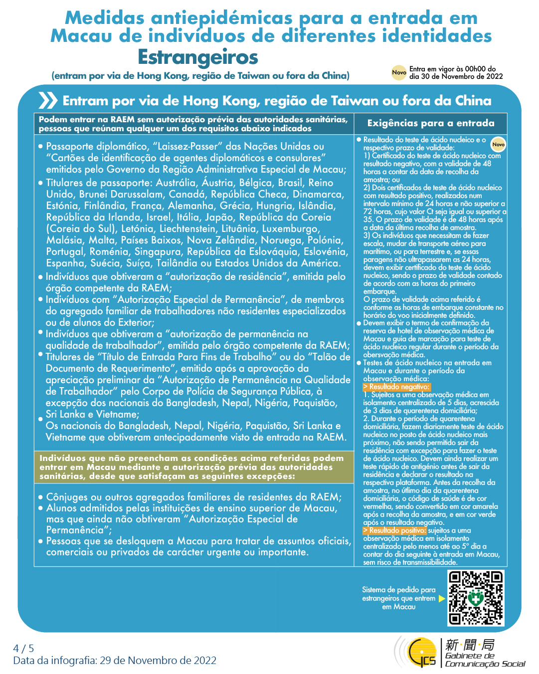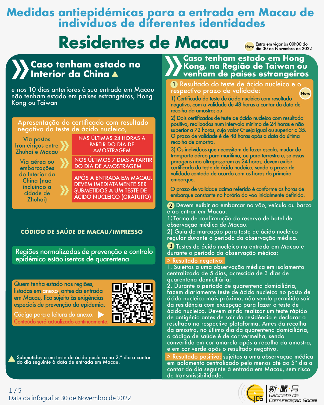 (Infografia) Medidas antiepidémicas para a entrada em Macau de indivíduos de diferentes identidades, actualizadas no dia 30 de Novembro de 2022.