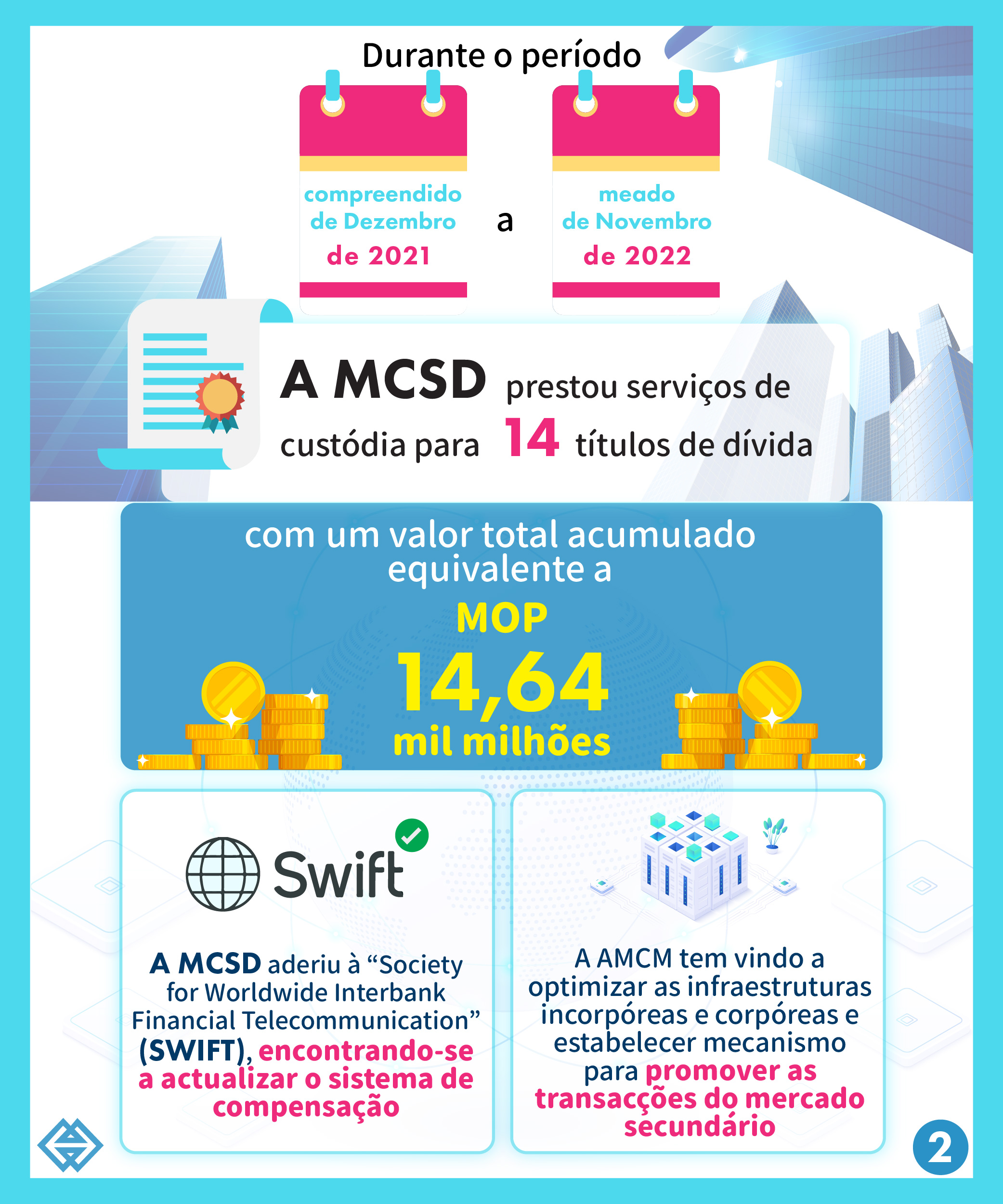 A MCSD iniciou a operação da “Central de Depósito de Valores Mobiliários de Macau”(CSD) desde Dezembro de 2021 e até meado de Novembro de 2022, foram prestados serviços de custódia para 14 títulos de dívida, tendo apoiado a emissão de obrigações nacionais em RMB do Governo Popular Central, obrigações “off-shore” do Governo Provincial de Guangdong e certificados de depósito a prazo negociáveis, com um valor total acumulado equivalente a MOP14,64 mil milhões. Recentemente, a MCSD tornou-se a ser membro institucional da “Society for Worldwide Interbank Financial Telecommunication” (SWIFT), encontrando-se a actualizar o sistema de compensação para satisfazer as necessidades de transacções dos participantes dos mercados de diferentes fusos horários.