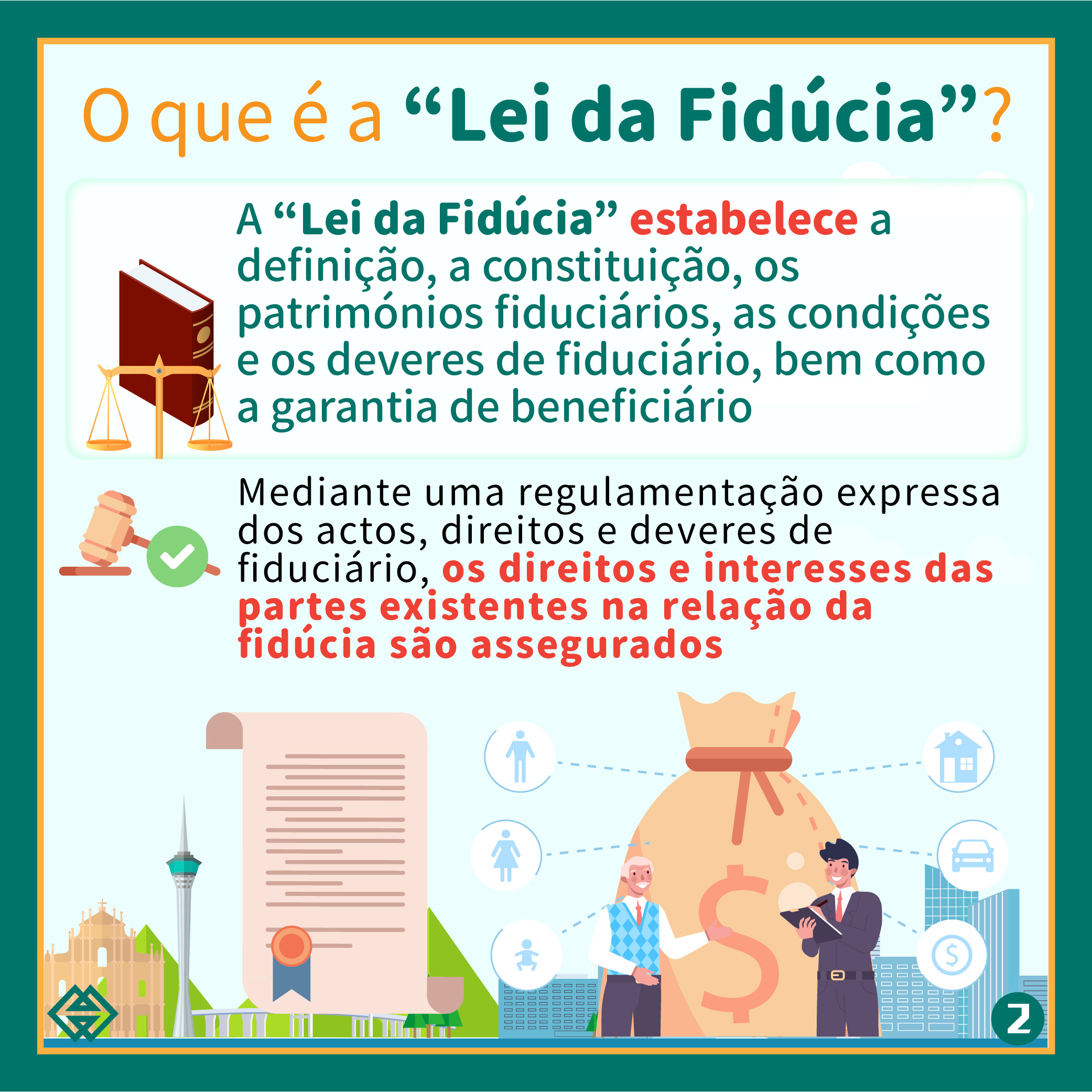A “Lei da Fidúcia” estabelece a definição, a criação, os patrimónios fiduciários, as condições e os deveres de fiduciário, bem como a garantia de beneficiário. Sendo a fidúcia um instrumento de gestão de património acolhido de forma genérica, o fiduciante deve transmitir os patrimónios fiduciários para fiduciário, para que este o possa gerir e conceder benefício fiduciário para o beneficiário, de acordo com a vontade de fiduciante. Nos termos estabelecidos no acto constitutivo da fidúcia, o beneficiário tem direito ao benefício fiduciário, podendo solicitar ao fiduciário informações sobre a administração da fidúcia.