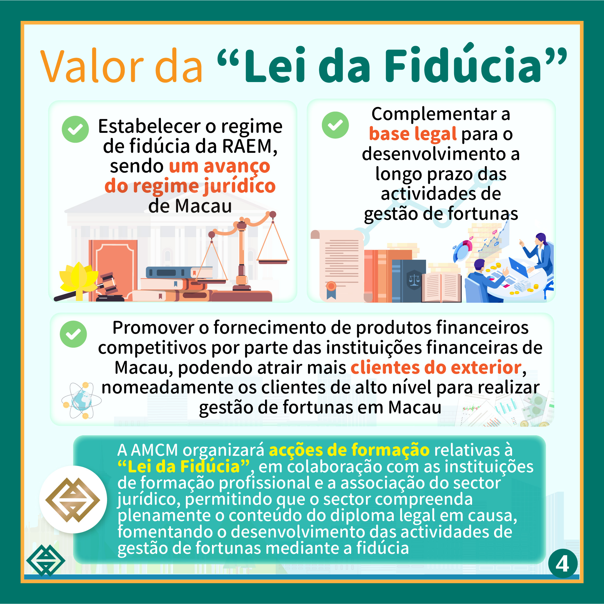 A Autoridade Monetária de Macau (AMCM) afirmou que a promulgação da “Lei da Fidúcia” é um avanço do regime jurídico de Macau, complementando a base legal para o desenvolvimento a longo prazo das actividades de gestão de fortunas, promovendo o fornecimento de produtos financeiros competitivos por parte das instituições financeiras de Macau, podendo atrair mais clientes do exterior, nomeadamente os clientes de alto nível para realizar gestão de fortunas em Macau, empenhando assim função proactiva para estimular o desenvolvimento do sector financeiro moderno, bem como para o desenvolvimento coordenado da Zona de Cooperação Aprofundada entre Guangdong e Macau em Hengqin e da Grande Baía Guangdong-Hong Kong-Macau.