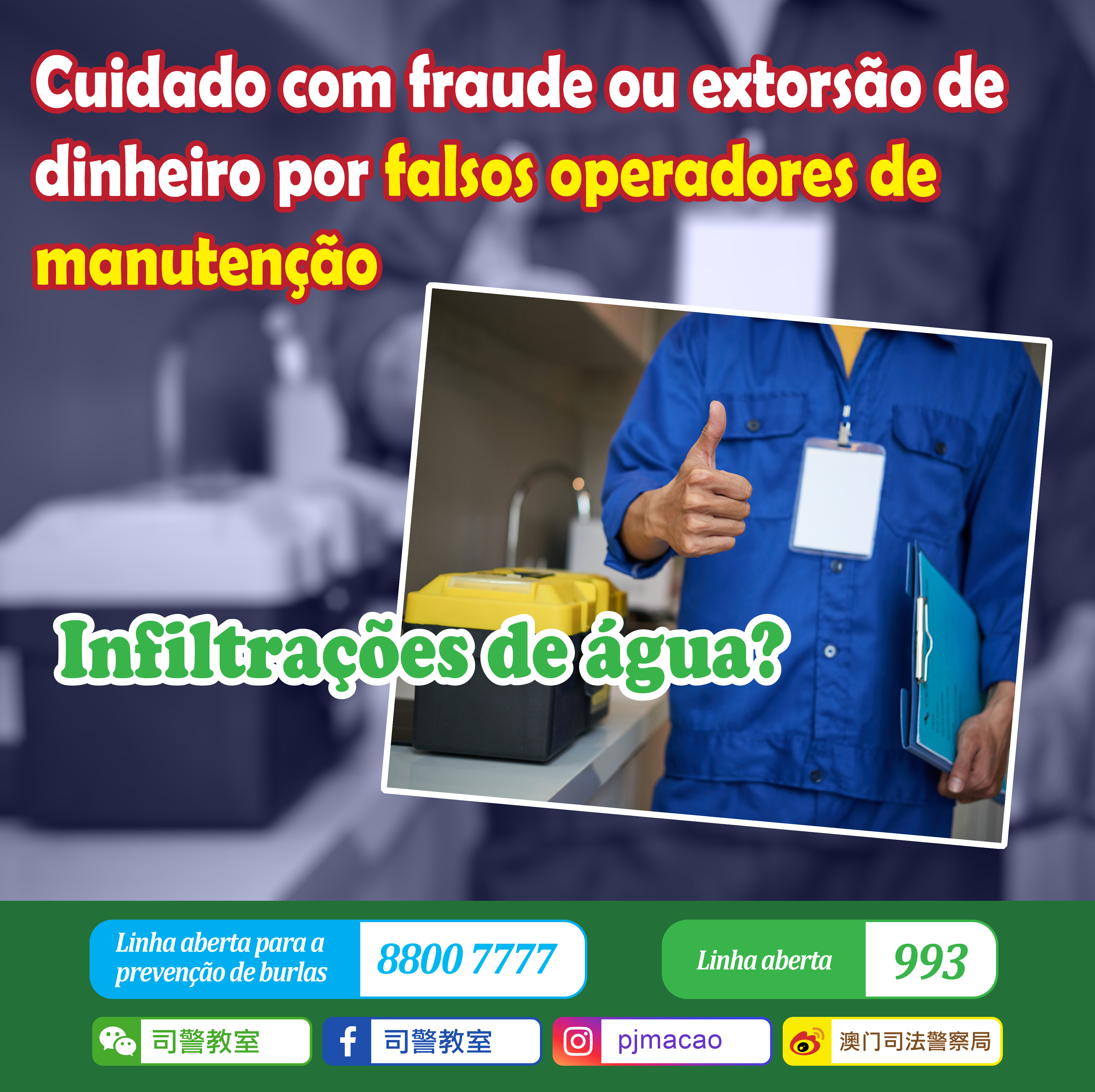 A PJ recebeu denúncias nos últimos dias, referindo que uma pessoa utilizou a rede social para publicitar uma empresa de construção civil dizendo que podia prestar o serviço de inspecção e reparação de infiltrações de água da habitação residencial. Várias vítimas que contactaram esta empresa para fazer inspecção nas suas casas, concordaram com a proposta do orçamento para fazer a reparação mas, depois da conclusão da obra, foi-lhes pedido que pagassem um montante muito mais elevado do que o orçamentado. Sob a ameaça feita pela outra parte, as vítimas pagaram o montante exigido e, seguidamente, pediram a ajuda da polícia.