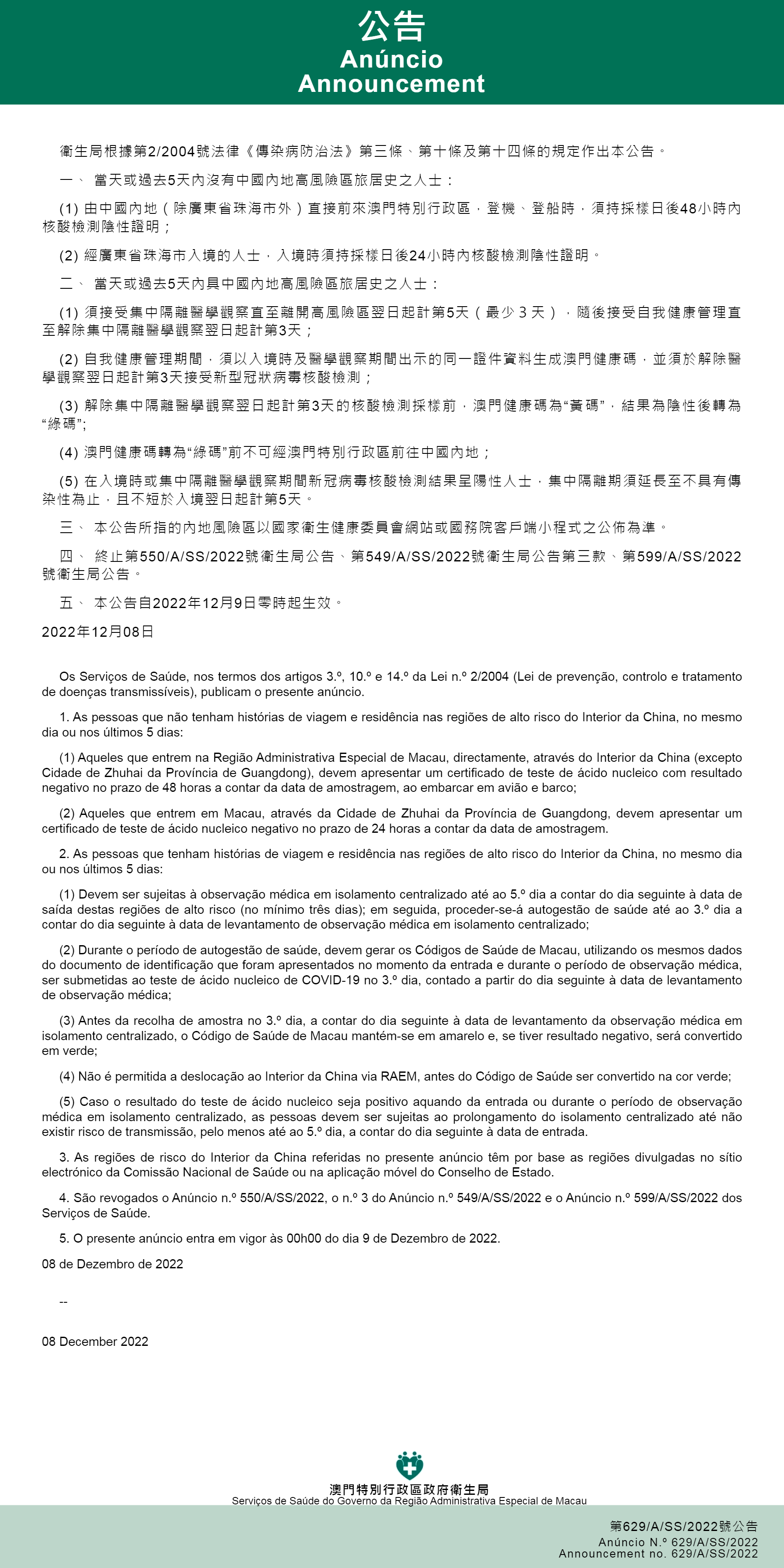 O Centro de Coordenação de Contingência do Novo Tipo de Coronavírus informa que, nos termos dos artigos 3.º, 10.º e 14.º da Lei n.º 2/2004 (Lei de Prevenção, Controlo e Tratamento de Doenças Transmissíveis), os Serviços de Saúde emitem os seguintes anúncios nº 629/A/SS/2022 e nº 630A/SS/2022.