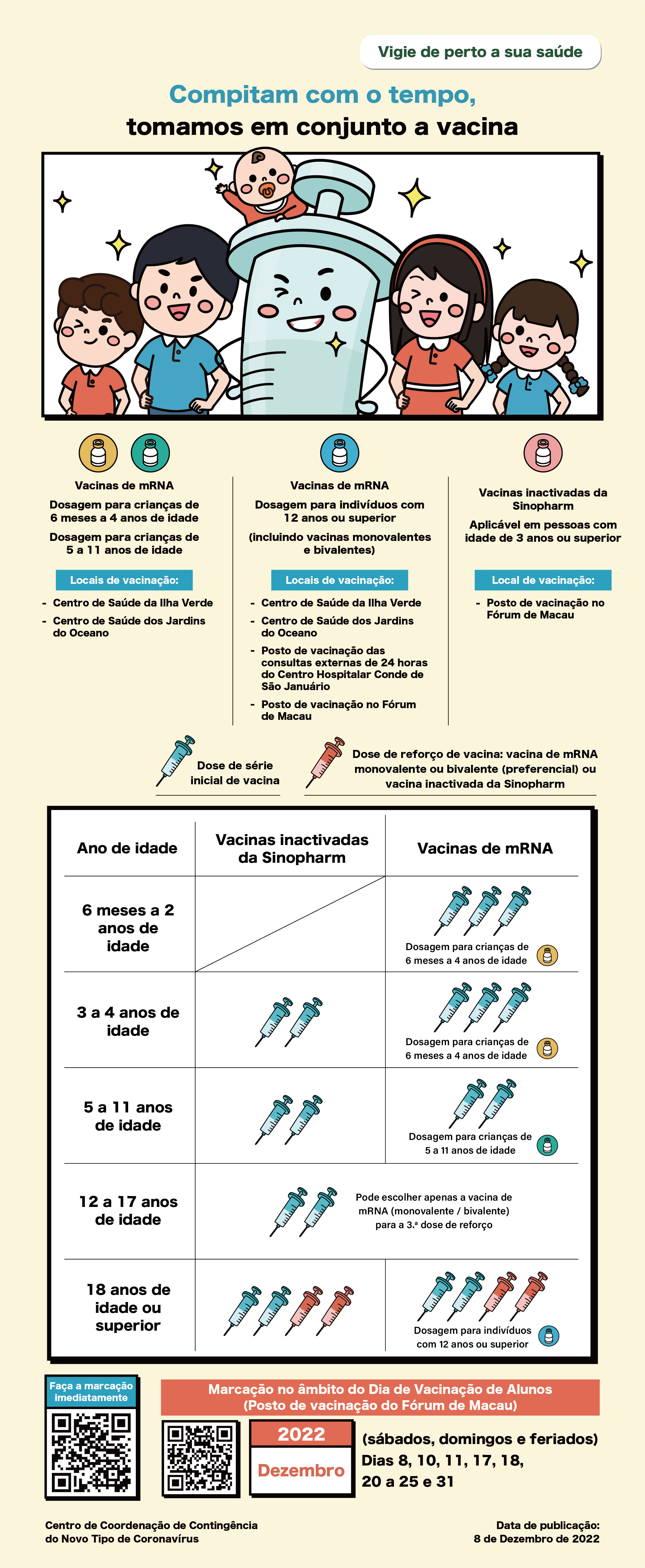 A DSEDJ adverte que depois da inoculação da vacina, são necessárias, no mínimo, duas semanas para o corpo humano criar defesas imunitárias suficientes, pelo que os pais devem aproveitar bem o tempo, as ocasiões em que as escolas organizam as sessões de inoculação ou os fins-de-semana e feriados em Dezembro, de forma a efectuarem a marcação oportuna para a vacinação dos seus filhos. Os pais também devem deslocar-se ao local de vacinação correspondente à idade dos seus filhos, à dosagem e ao número de doses da vacina, prestando atenção às informações mais actualizadas sobre a vacina contra a COVID-19. Podem fazer uma leitura do código QR para as informações detalhadas, e proceder à marcação prévia depois de preenchimento do “Consentimento informado para vacinação contra a COVID-19”. Na data de vacinação, devem ser munidos dos documentos de identificação dos pais / tutores legais acompanhantes e dos alunos.