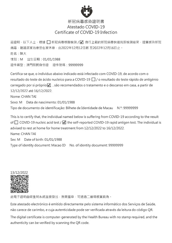 O “Atestado COVID-19” incorpora o código QR, após a sua leitura, pode ser encaminhado para a página electrónica dos Serviços de Saúde para efeitos de confirmação da autenticidade do conteúdo do atestado. Caso as pessoas infectadas ainda tenham resultado positivo de teste de antigénio na manhã do 6.º dia, podem ainda carregar o resultado do teste de antigénio e fazer a respectiva declaração na página electrónica, com vista a obter um novo “Atestado COVID-19” e prolongar o seu tratamento domiciliário por mais dois (2) dias.