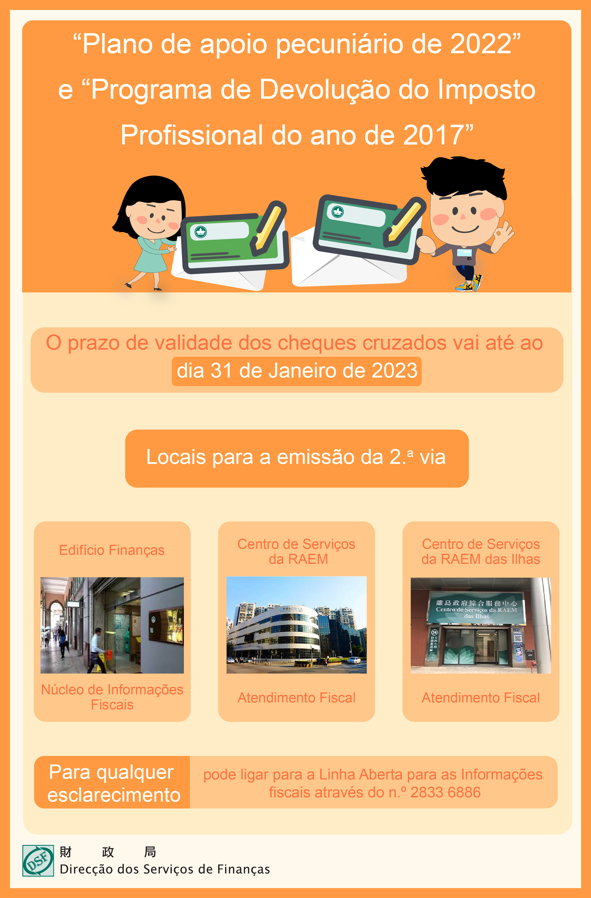 A Direcção dos Serviços de Finanças alerta os cidadãos para estarem atentos ao prazo de validade para o depósito dos cheques do “Plano de apoio pecuniário para aliviar o impacto negativo da epidemia nos trabalhadores, profissionais liberais e operadores de estabelecimentos comerciais em 2022” e do “Programa de Devolução do Imposto Profissional do ano de 2017”, que vai até ao dia 31 de Janeiro de 2023.