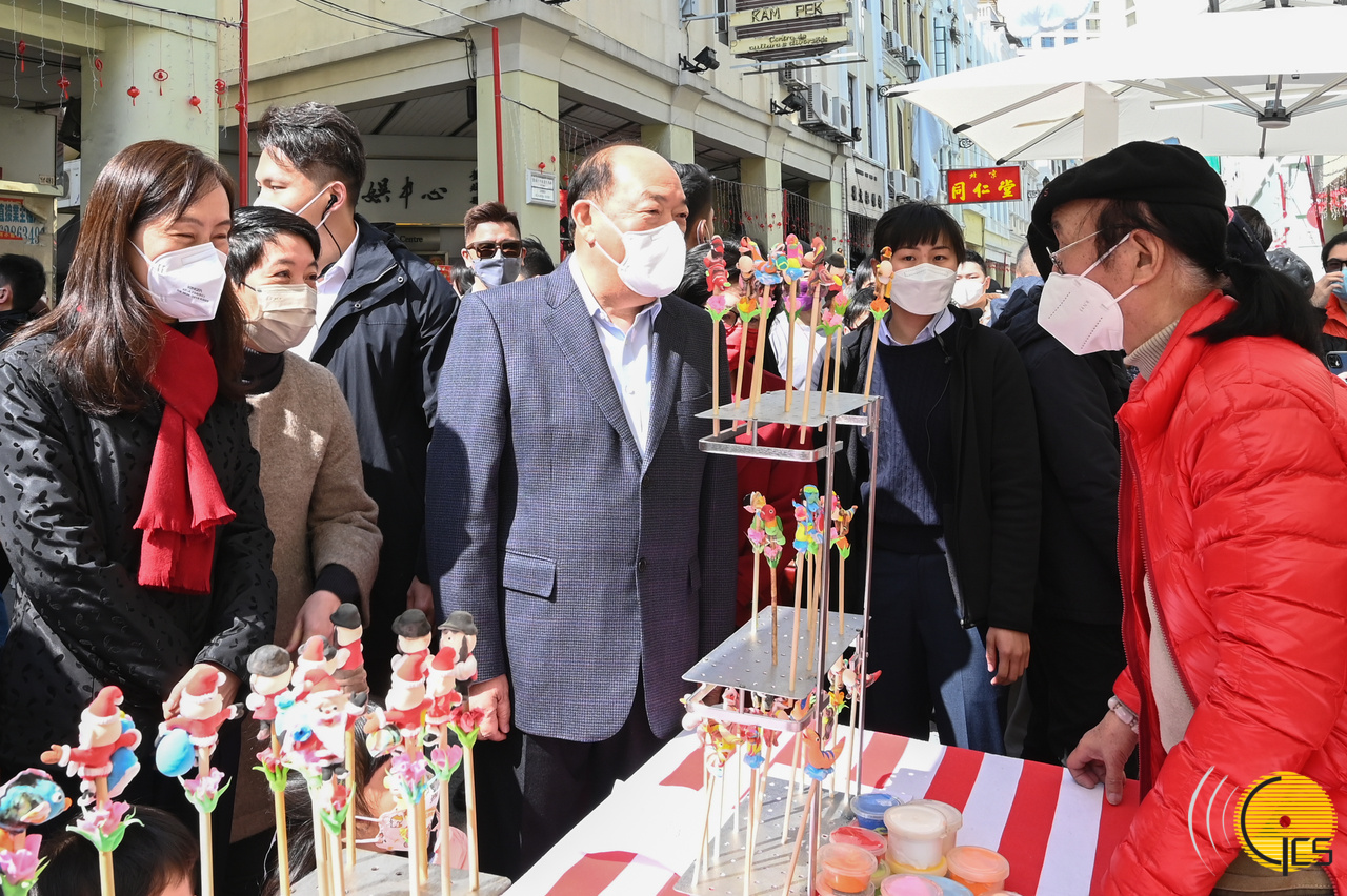 O Chefe do Executivo, Ho Iat Seng, e a esposa, acompanhados pela secretária para os Assuntos Sociais e Cultura, Ao Ieong U, Chefe do Gabinete do Chefe do Executivo, Hoi Lai Fong, e presidente do Instituto Cultural, Leong Wai Man, chegaram esta manhã, cerca das 11h00, à Rua de Cinco de Outubro, começando um passeio por vários locais da cidade, nomeadamente o Largo do Pagode do Bazar, a Avenida de Almeida Ribeiro, a Rua da Felicidade e o Largo do Senado. Durante o passeio, Ho Iat Seng apresentou aos comerciantes as saudações festivas e desejos de bons negócios. Aproveitou a oportunidade para conversar com comerciantes e ficar a conhecer a situação dos negócios, com a maioria deles a elogiar a iniciativa “Passeando pela Almeida Ribeiro – Projecto piloto para área pedonal”, e a indicar que traz muitos turistas a Macau, disseram ainda que o negócio está a recuperar de forma gradual, e que, por essa razão, estão confiantes que a situação fique cada vez melhor.