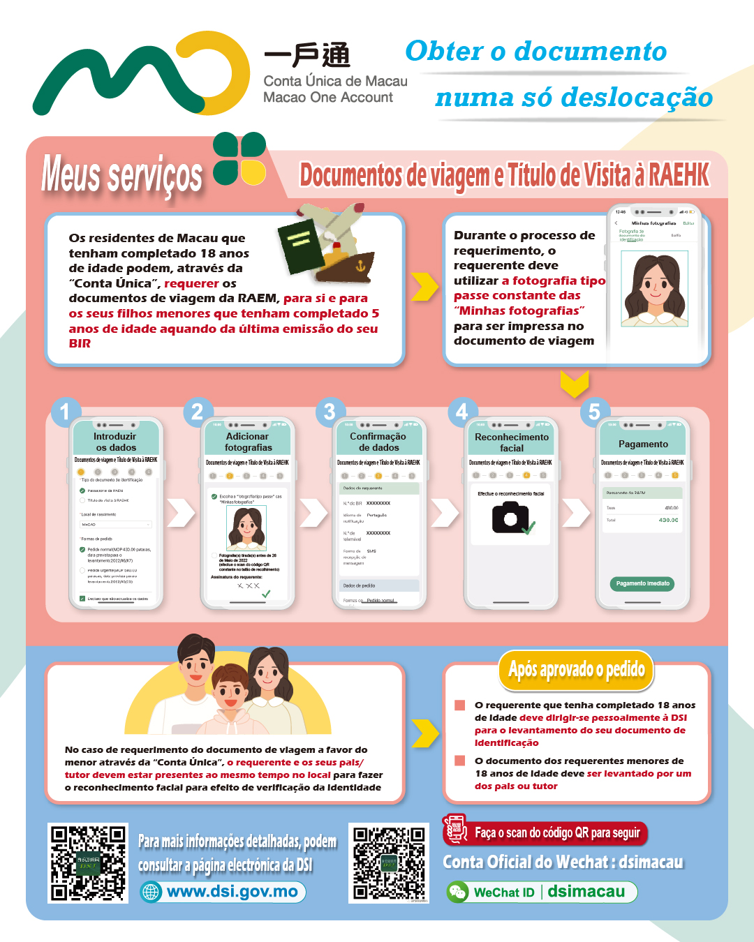 Os titulares do Bilhete de Identidade de Residente da RAEM que tenham completado 18 anos de idade e que pretendam tratar dos documentos de viagem da RAEM, podem através dos quiosques de auto-atendimento ou meios online (Conta Única), requerer os documentos para si e para os seus filhos menores que tenham completado 5 anos de idade aquando da última emissão do seu BIR. Para as pessoas que não têm plano de viagem, a DSI sugere que tratem dos documentos junto da DSI posteriormente.