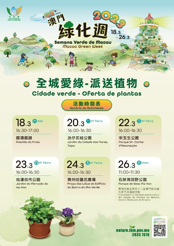 Esta edição da Semana Verde tem como tema “Transmissão do amor pela arborização para a construção de uma bela cidade” e, seguindo o espírito do “Dia Mundial da Árvore”, serão realizadas várias actividades de plantação de árvores e actividades experimentais para o público, de modo a divulgar junto dos residentes conhecimentos sobre os recursos das zonas verdes de Macau, os desafios enfrentados na protecção das árvores e os resultados obtidos na conservação ecológica, bem como compartilhar as funções e os trabalhos quotidianos das diversas entidades de arborização, para que o público possa ter mais contacto com os trabalhos de conservação da natureza.