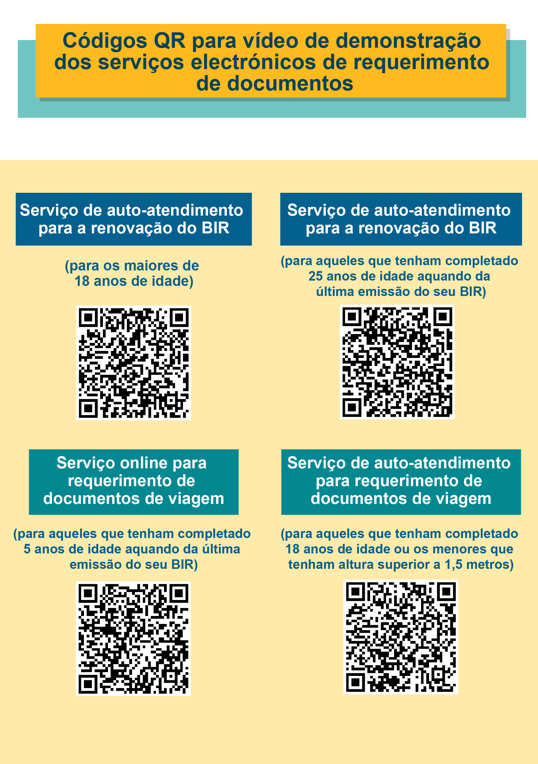 Por outro lado, sugere-se que os indivíduos que preenchem os requisitos utilizem, prioritariamente, a “Conta Única de Macau” ou os quiosques de auto-atendimento para tratar, por via electrónica, do requerimento de documentos, podendo consultar os vídeos de demonstração dos serviços electrónicos de requerimentode documentosatravés da leitura dos respectivos códigos QR. Para mais informações, queira ligar para a linha aberta da DSI (2837-0777 ou 2837-0888) ou enviar email para info@dsi.gov.mo.