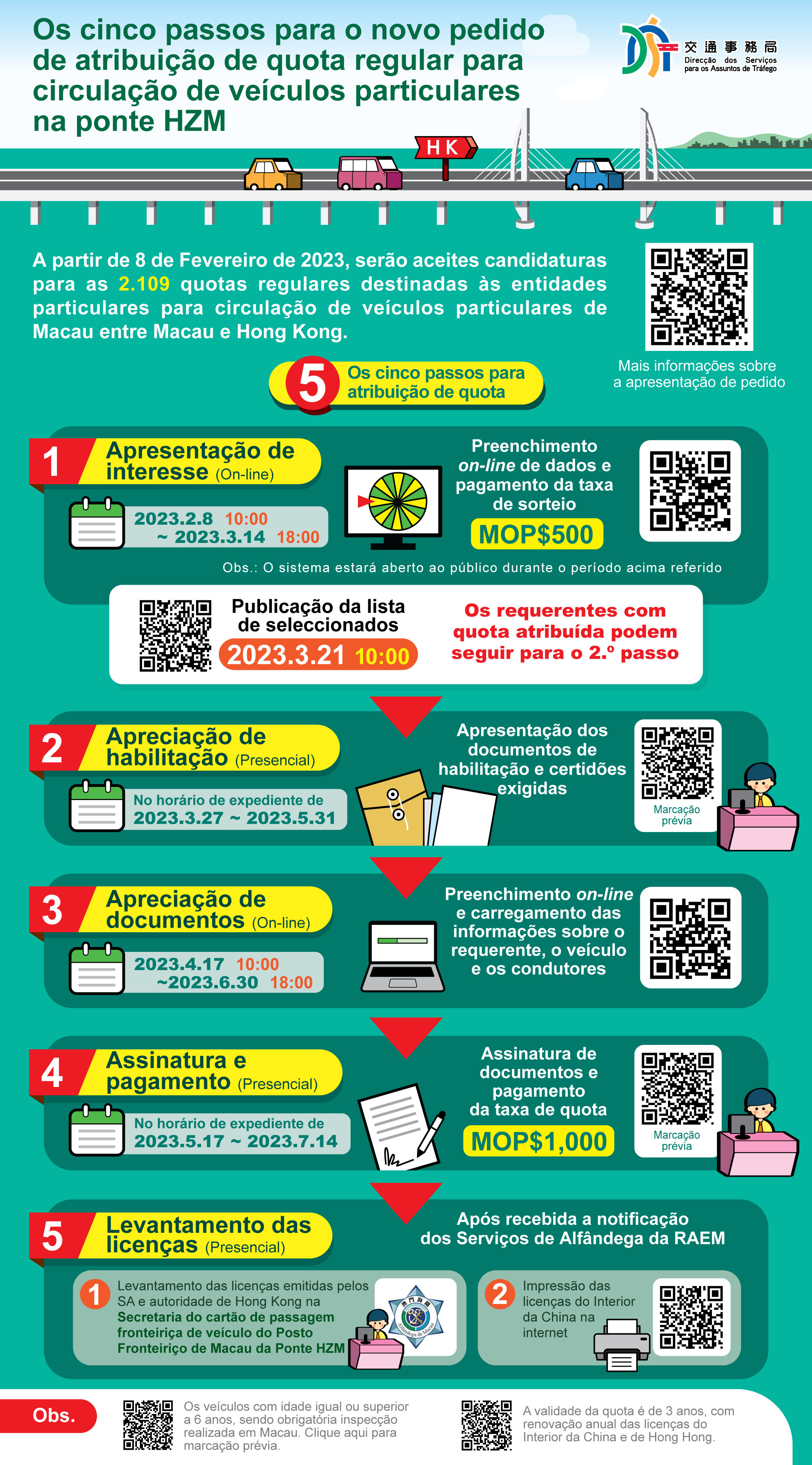 A inscrição para atribuição de 2.109 novas quotas regulares de circulação de veículos particulares de Macau entre Macau e Hong Kong foi lançada no dia 8 de Fevereiro do corrente ano e terminada no dia 14 de Março. Durante esse período, a Direcção dos Serviços de para os Assuntos de Tráfego (DSAT) recebeu um total de 8.881 pedidos de manifestação de interesse. Foi tornada pública, via o seguinte website, a lista de requerentes ordenados por sorteio informático https://www.dsat.gov.mo/hzmb/car_cross_2023.aspx.