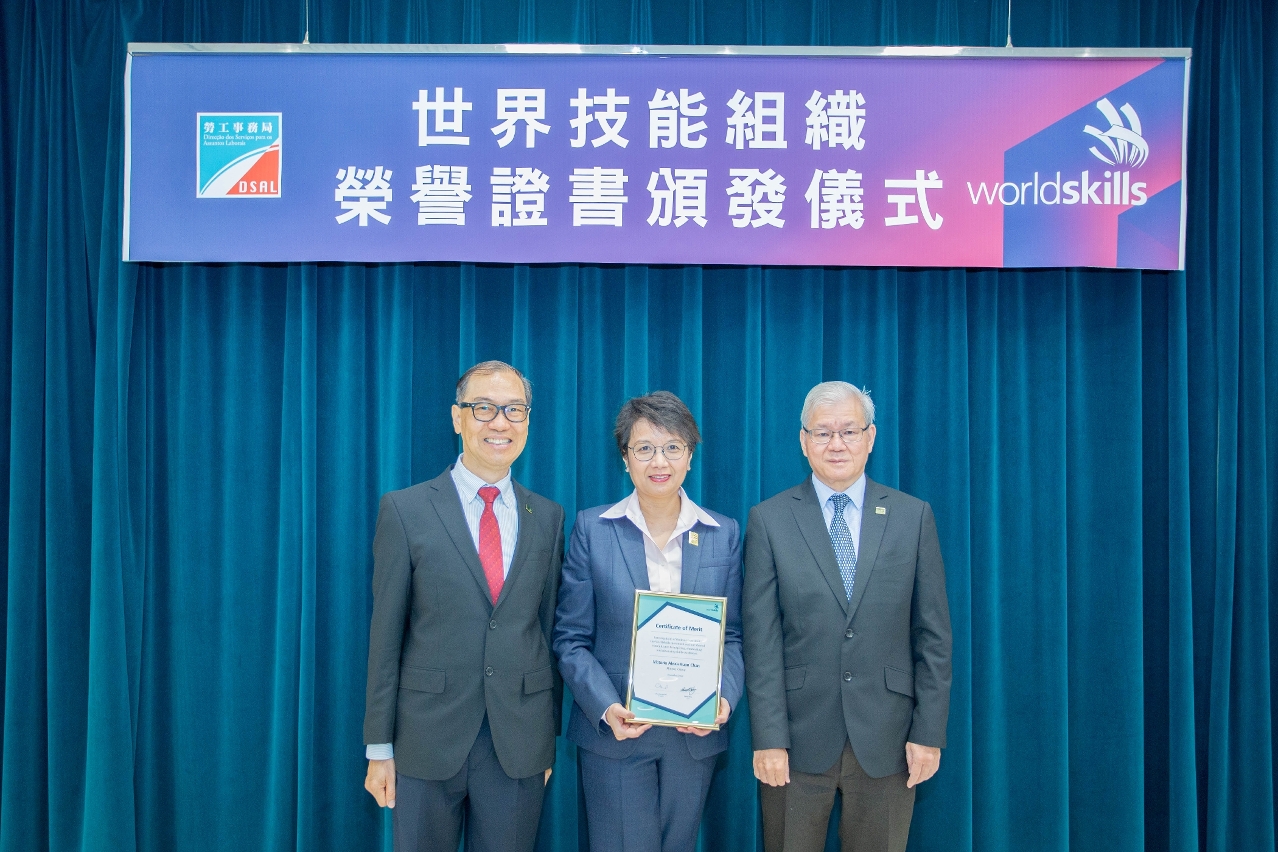 Na Assembleia Geral de 2022 da World Skills International, tornou-se público que são atribuídos certificados honorários a cerca de 50 peritos em todo o mundo com vista a elogiar os contributos por eles dados à promoção do desenvolvimento mundial de aptidões profissionais. A Sra. Kuan Chan Victoria Alexa, directora-geral da Direcção do Centro de Produtividade e Transferência de Tecnologia de Macau (CPTTM), tornou-se a primeira representante de Macau que recebeu essa distinção pelo seu contributo dado à promoção do desenvolvimento mundial de aptidões profissionais.