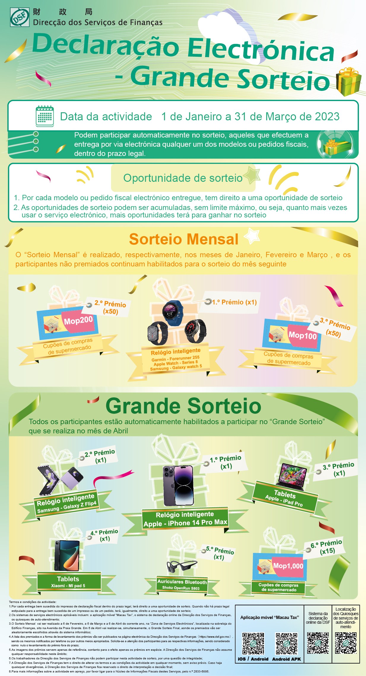 Para efeitos de consulta, a lista de vencedores deste grande sorteio, organizado no âmbito da declaração electrónica, encontrava-se carregada, no mesmo dia, na página electrónica da DSF (https://www.dsf.gov.mo), sendo a notificação do levantamento dos prémios aos vencedores feita através do envio de mensagem instantânea pelo telemóvel, solicitando que o referido levantamento pelos vencedores seja efectuado antes de 5 de Maio no Edifício “Finanças”, sito na Avenida da Praia Grande.