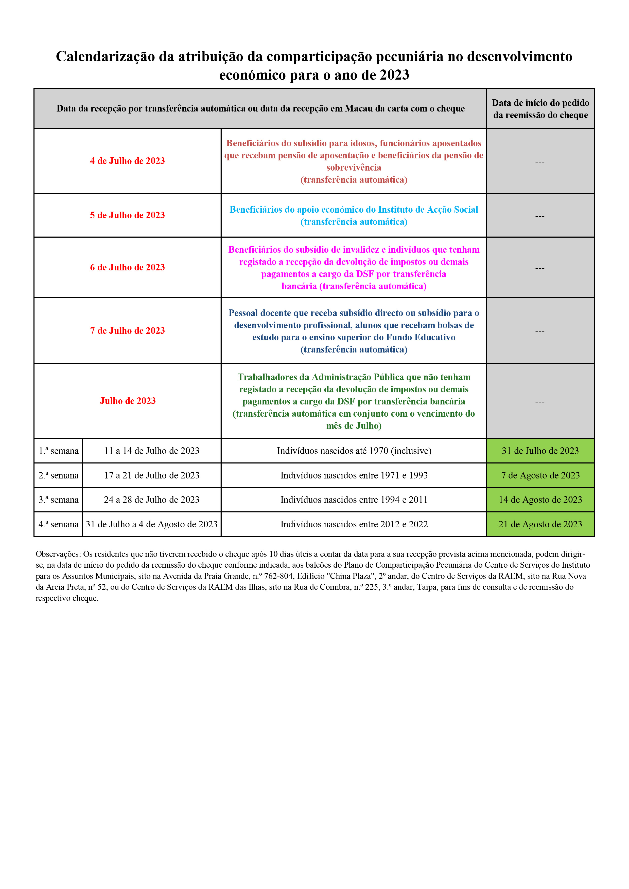 O programa de atribuição do plano de comparticipação pecuniária do ano em curso é idêntico ao do ano transacto, realizando-se, fundamentalmente, através de duas formas – transferência bancária ou envio postal de cheque cruzado – para atribuir o montante a todos os residentes elegíveis. Aos indivíduos que recebam subsídios diversos, fundos de apoios, remunerações de funcionários públicos e aos indivíduos que tenham optado pela transferência bancária para receber a devolução de impostos ou demais pagamentos, os montantes da comparticipação pecuniária vão ser transferidos, directamente, para a conta bancária própria. Relativamente aos demais indivíduos que reúnam os requisitos, a comparticipação pecuniária vai ser, também, paga em quatro semanas, mediante cheque cruzado a enviar, por via postal, de acordo com a ordem cronológica do ano de nascimento.