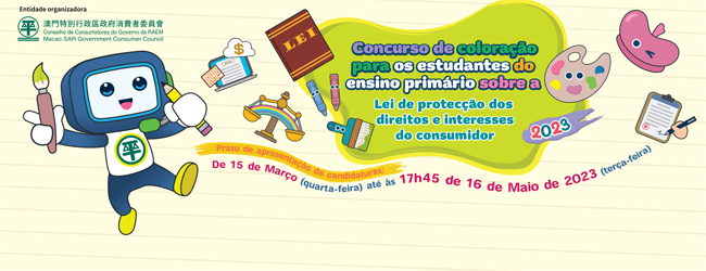 No sentido de aprofundar o conhecimento de estudantes sobre a Lei de protecção dos direitos e interesses do consumidor, o Conselho de Consumidores (CC) realiza um concurso de coloração para os estudantes do ensino primário, com o prazo de candidatura e apresentação de obras até ao dia 16 de Maio de 2023, sendo bem-vinda a participação proactiva de todos os estudantes.